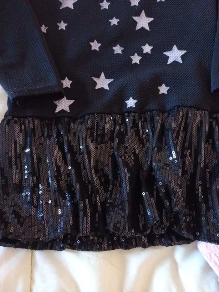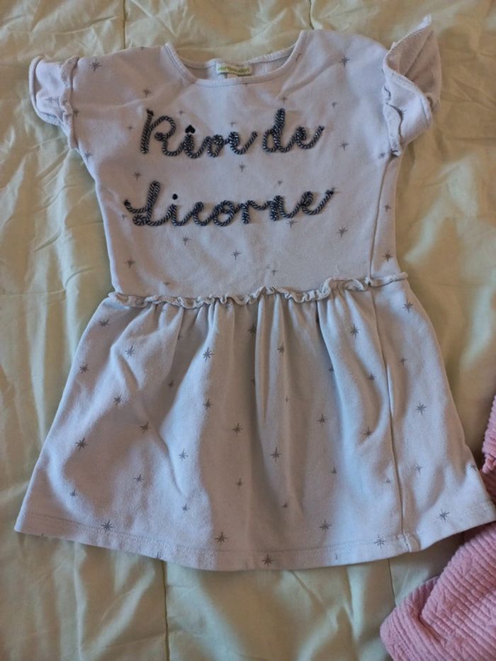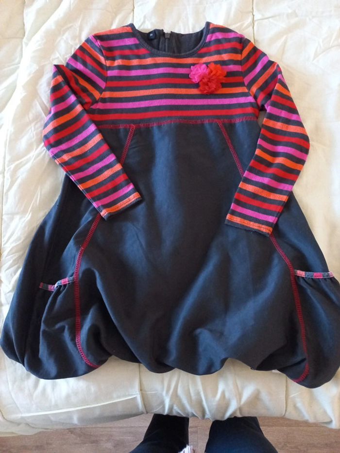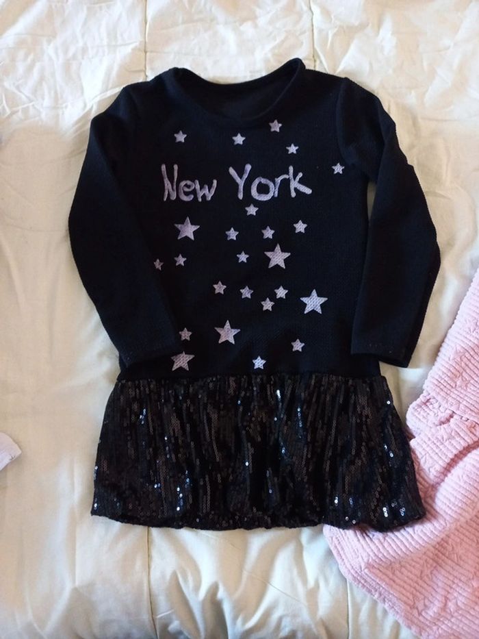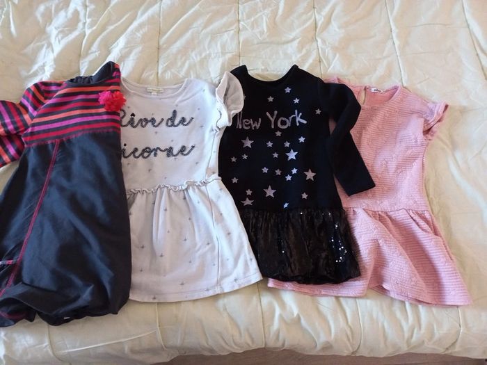 2 robes manches courtes 2 robes manches longues Elles sont assez épaisses pour l'hiver. La noire new York est comme neuve elle a été porté 2 fois l'étiquette est 6 ans mais elle taille petite. Elle n'est pas en coton mais principalement en polyester. La robe boule est etiquetté 5 ans mais taille peut être un peu plus grand. Elle est doublée coton sinon polyester. Les 2 autres sont plus épaisses mais aussi plus portées. 1 gemo 5 ans et 1 vertbaudet 6 ans qui taille comme la gemo en 5 ans. #lenkekepuces5ans