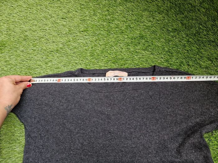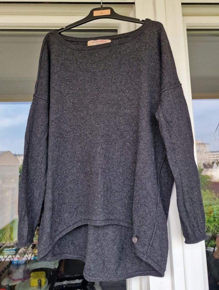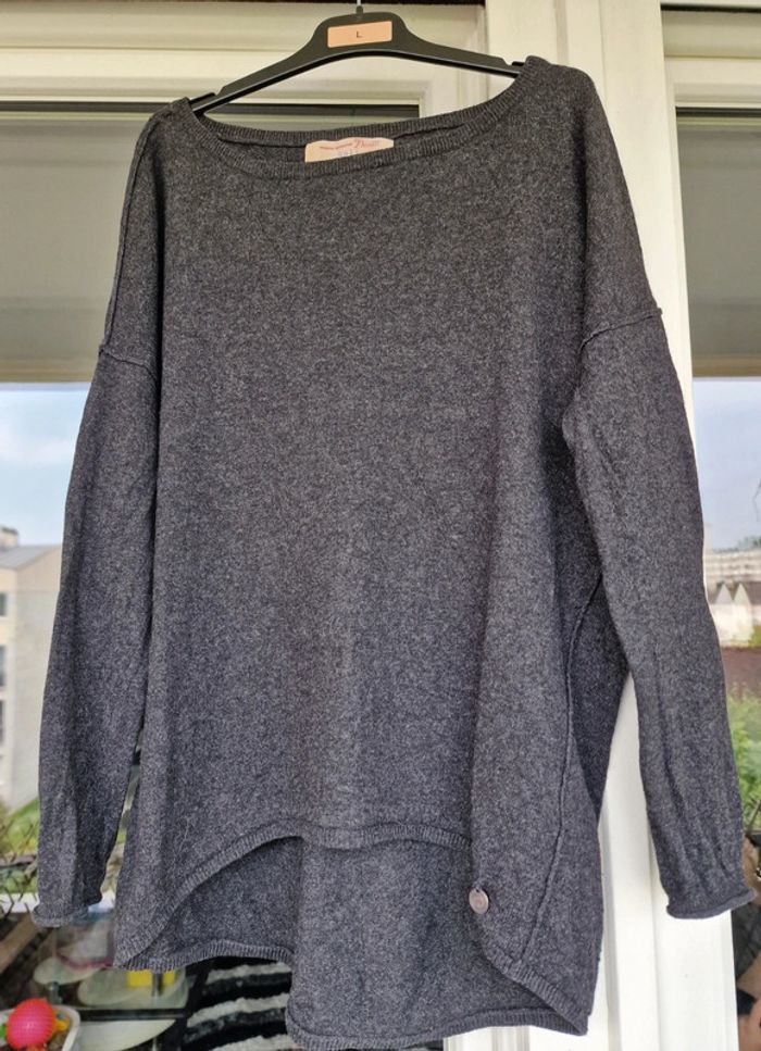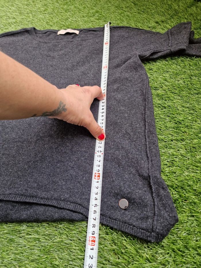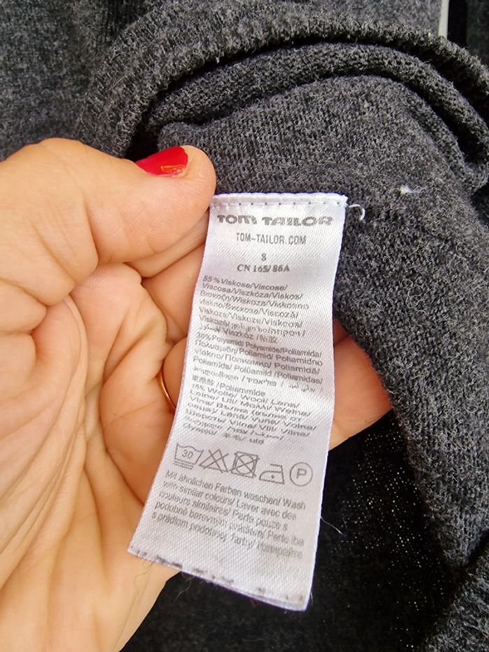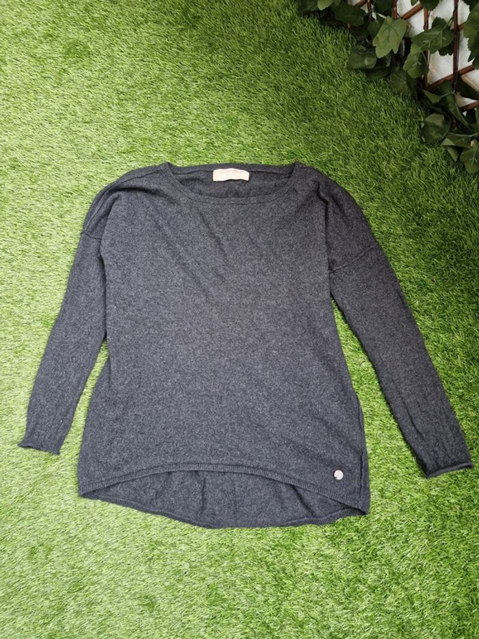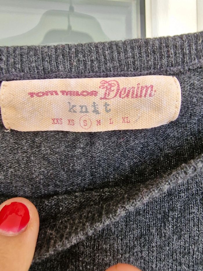 Parfait état, pas de défauts. Pull gris de Tom Tailor Denim. Taille S, correspond à EU 36/38. Composition: 55% Viscose, 30% polyamide, 15% laine. Mesures: 55 cm entre les aisselles, longueur 57 cm devant (derrière il est plus long), longueur manche à partir de aisselle 40 cm.