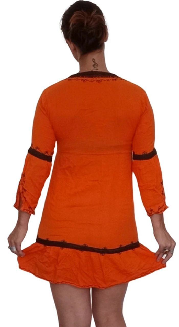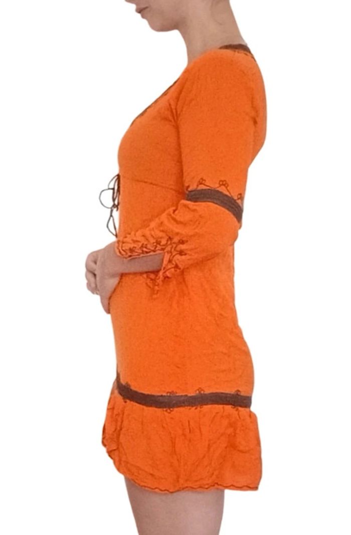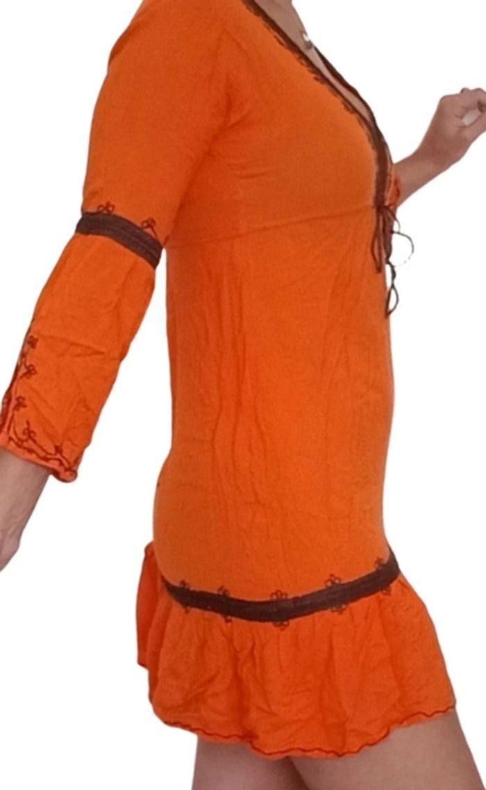 📣 Pour un lot, me contacter 😊🌸 -10% pour deux articles achetés -20% pour trois et + 🥰 #poupoupidou34 #poupoupidou36 #poupoupidou38 🫶🫶🫶🫶🫶🫶 Robe style ethnique orange lacet au décolleté et broderies marron, manches trois quart, confortable et féminine #robeethnique #robecasual #robeorange #robeete #robe3436