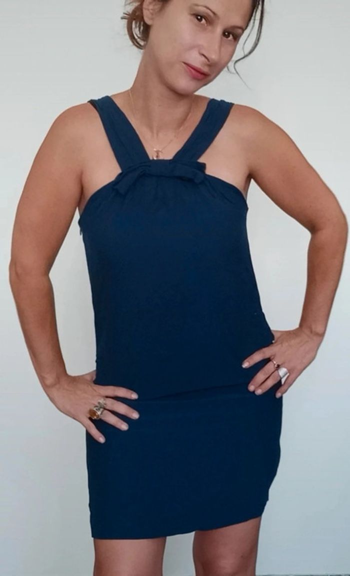 📣 Pour un lot, me contacter 😊🌸 -10% pour deux articles achetés -20% pour trois et + 🥰 #poupoupidou40 🫶🫶🫶🫶🫶🫶 Robe midi chic marine, droite, doublée, détail forme originale au niveau des bretelles avec noeud, épaules nues, féminine facile a assortir avec talons, veste, bijoux, etc... #robepromod40 #robechic40 #robemarine40 #robemidi40 #robenoeud40