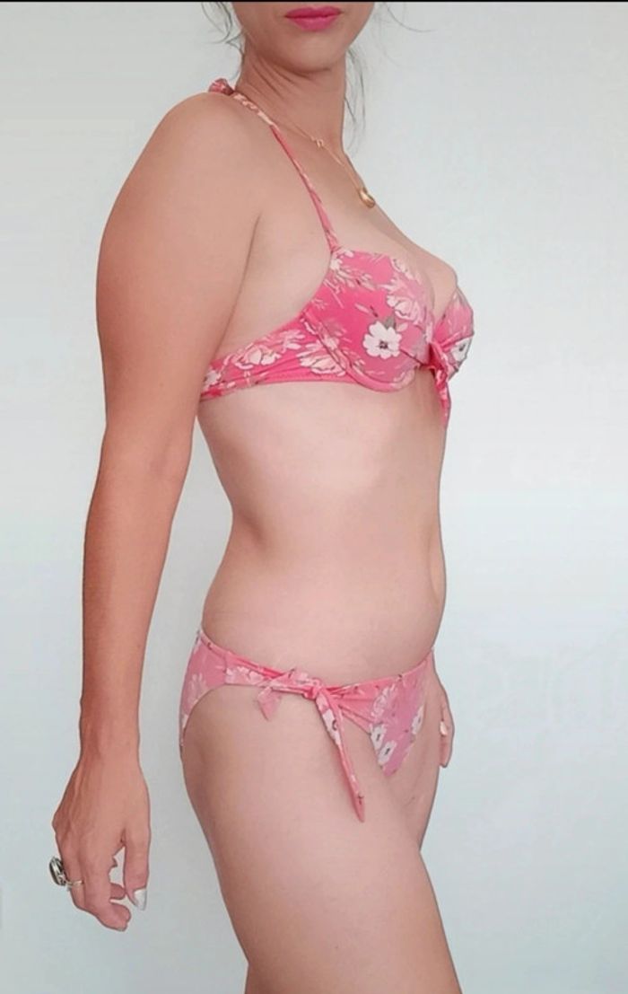 📣 Pour un lot, me contacter 😊🌸 -10% pour deux articles achetés -20% pour trois et + 🥰 #poupoupidou38 🫶🫶🫶🫶🫶🫶 Bikini rose fleuri, culotte échancrée a noeuds, haut avec armature effet push up, seulement " bon état" car couleur un peu "passée" par endroit mais sinon très bon maintien, 85B maximum! #bikibi #bikini38 #bikinisexy #bikinietam38
