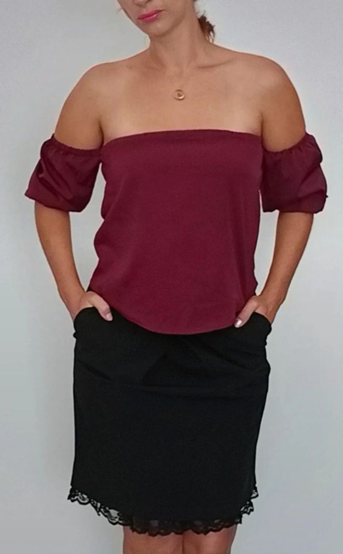 📣 Pour un lot, me contacter 😊🌸 -10% pour deux articles achetés -20% pour trois et + 🥰 #poupoupidou36 🫶🫶🫶🫶🫶🫶🫶 Haut bordeau chic épaules nues manches courtes élastiques, féminin et facile a assortir #haut36 #hautsaintvalentin #hautchic36 #hauttallyweijl36 #hautfeminin36 #hautepaulesdenudees36 #hautbabydoll #hautsoiree36 #hautbordeaux36
