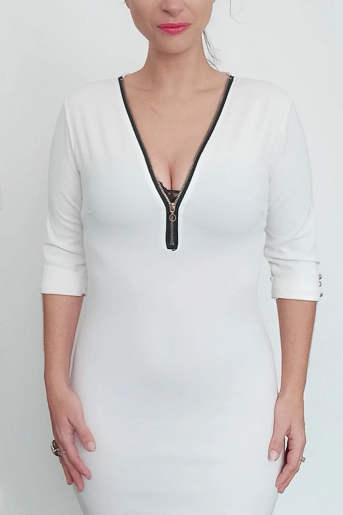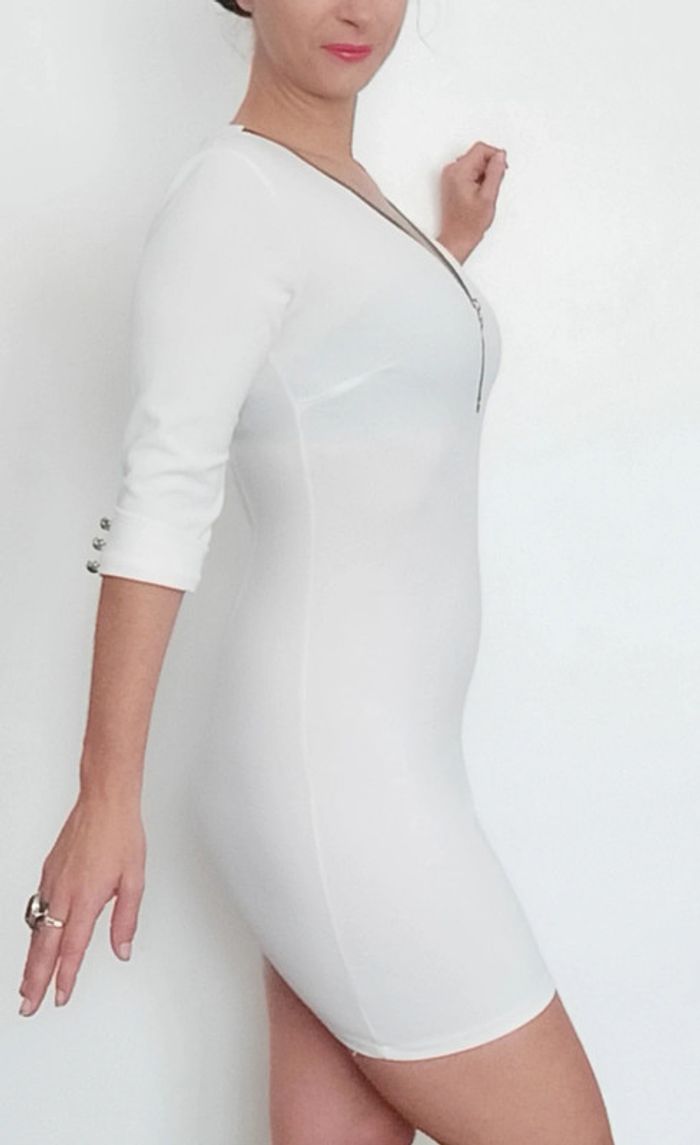 Robe moulante #sexy manches trois quarts, fermeture éclair pour régler la profondeur du décolleté #robechic #robeblanche #robedecolletée #robesexychic #robemoulante #minirobe