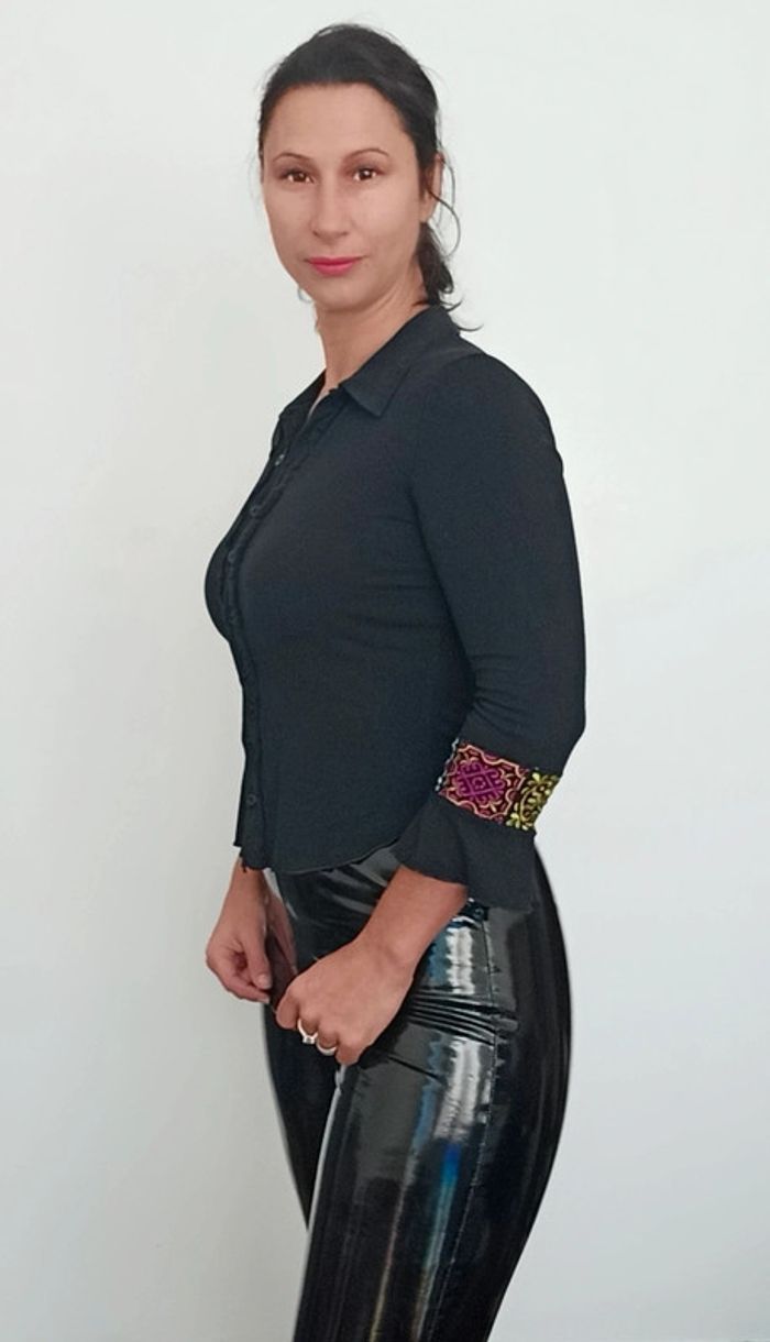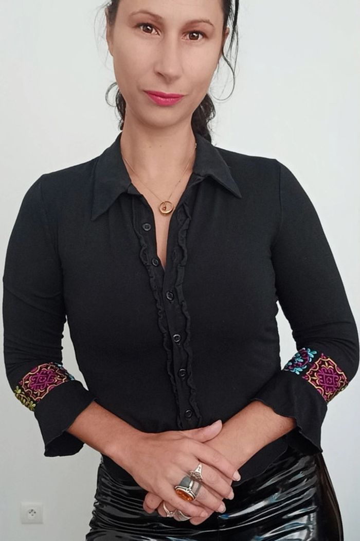 Gilet confortable, près du corps, détail manches trois quarts volantées avec frisés colorées ethniques chics , facile à assortir #sinequanone38 #gilet38 #giletfin38 #giletnoir38 #giletethnique38 #giletchic38 #giletsinequanone #poupoupidou38