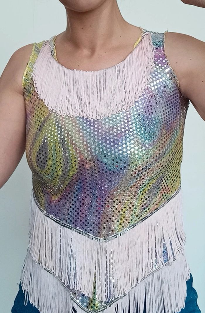 Haut paillettes arc en ciel avec franges longues, idéal #événement #soiree #fetes ferme par scratch derrière #topsoiree #toparcenciel #topfetes #topxxs #top32 #poupoupidou32 #topgala #toprainbow #topdisco