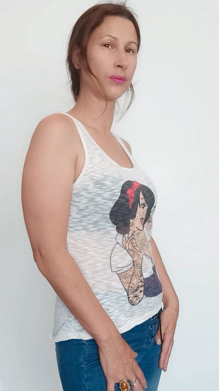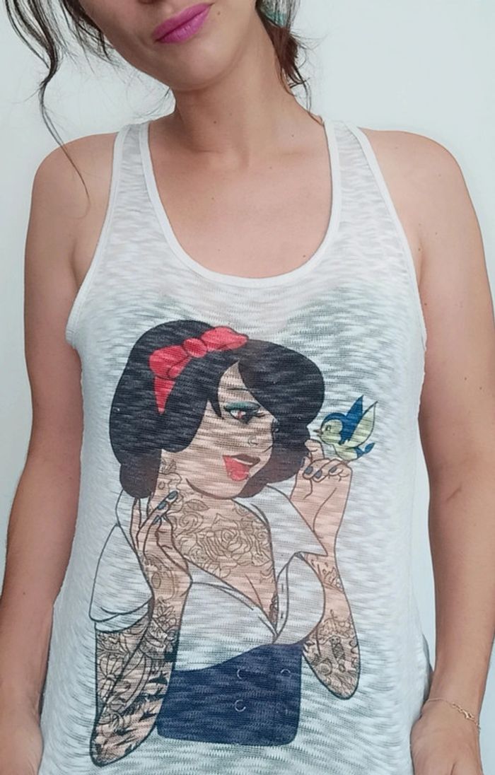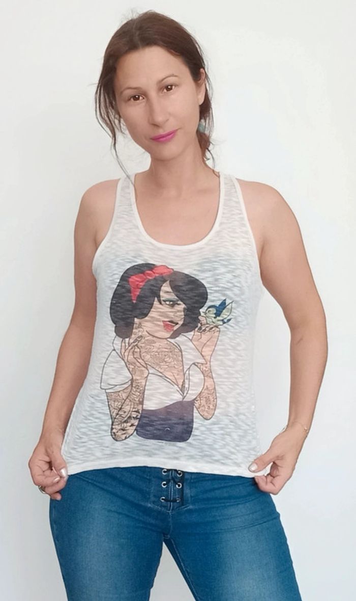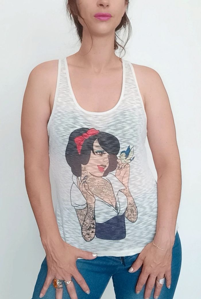 Effet usé et transparent, motif blanche neige tatouée, #débardeur #debardeurrock #débardeurblancheneige #debardeurgothique #débardeurtatouage #debardeursexy #debardeurtransparent