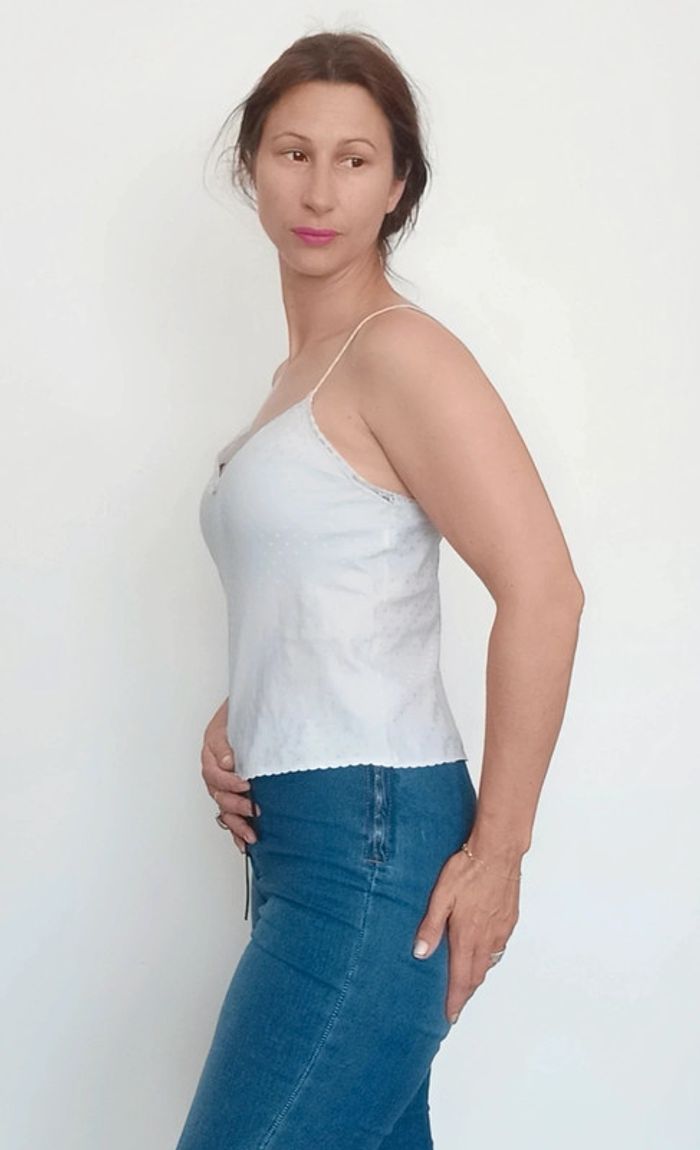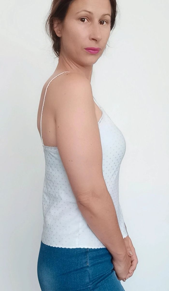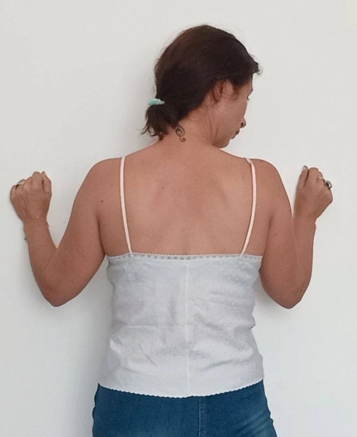 Top caraco satiné blanc détails losanges et petits pompons en bas, très fines bretelles, taille 34 #caraco #caracoblanc #topcaraco #caraco34 #topcaracoxs #caracoxs #caracosatiné #caracosatin34 #basic34 #poupoupidou34 #caracovintage