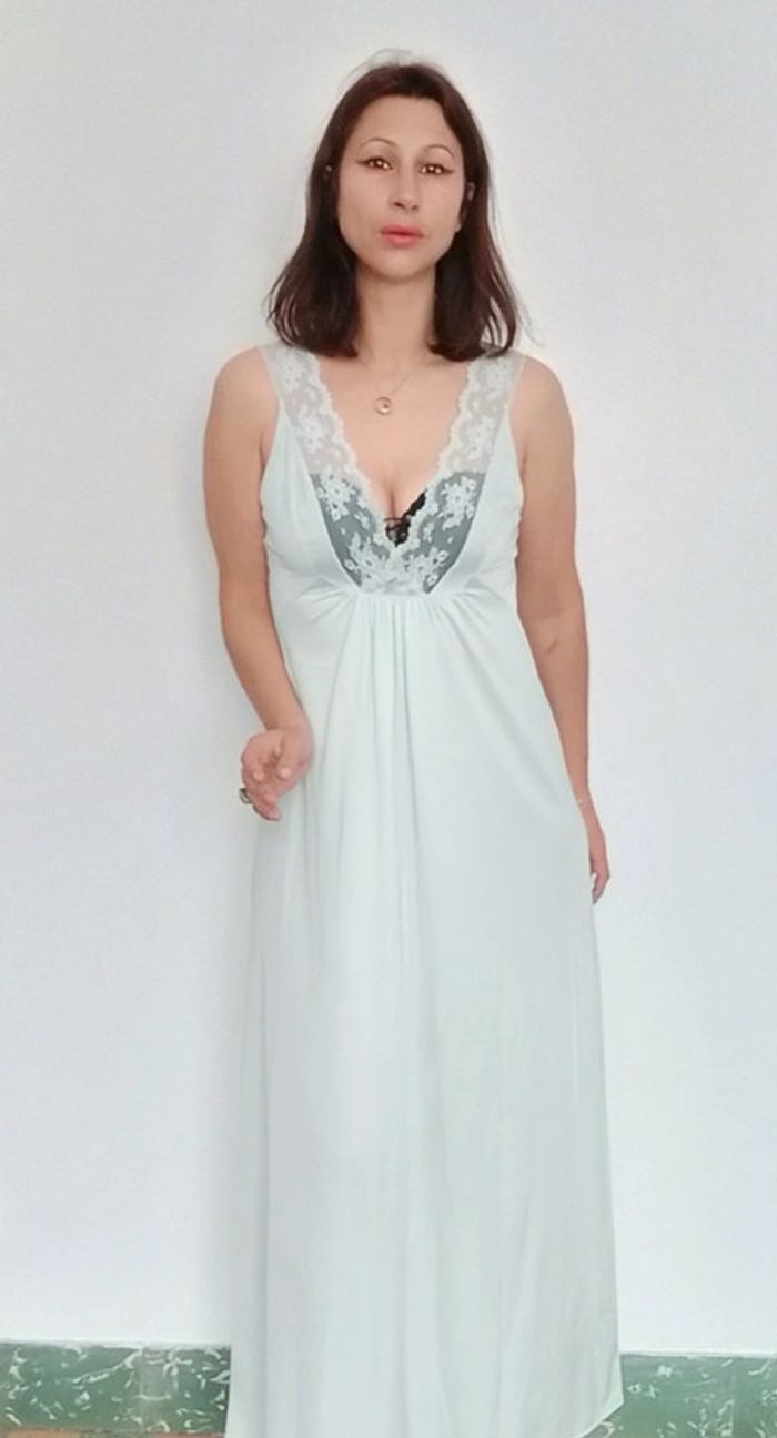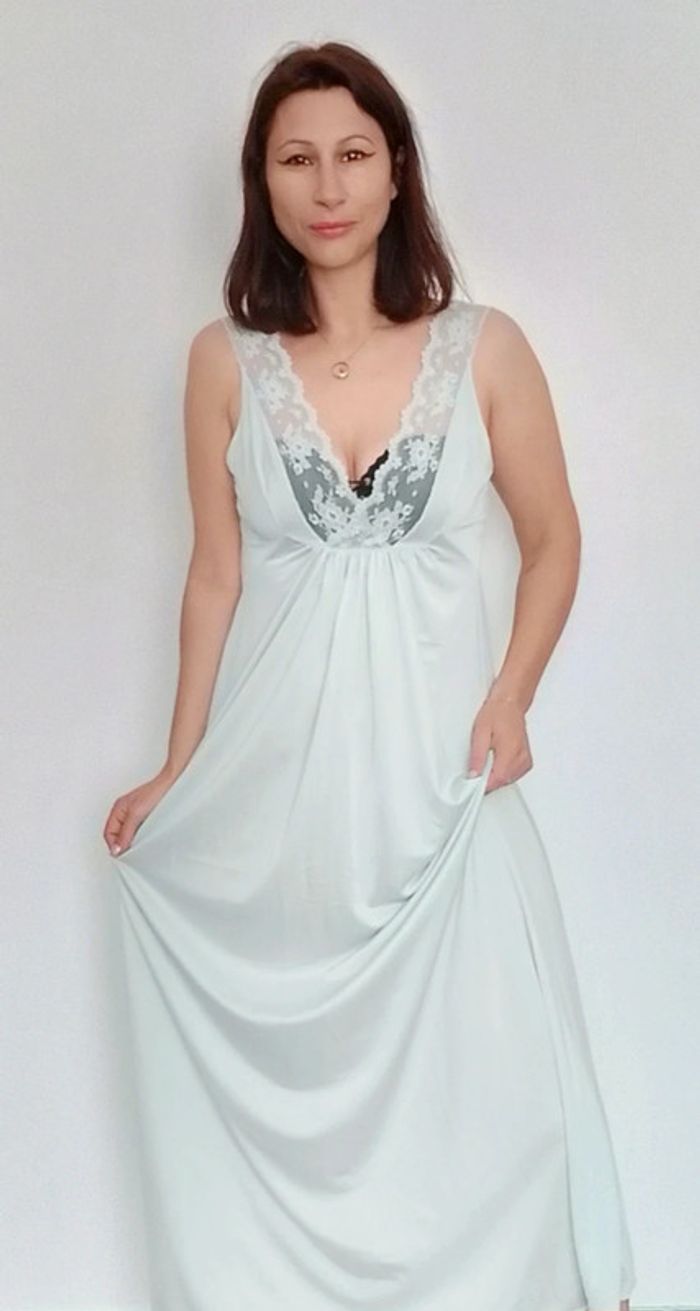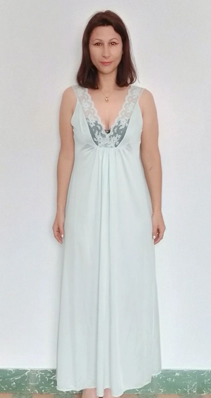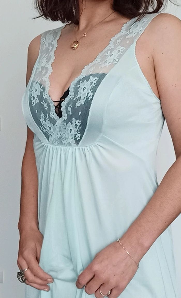 Douce, bien longue, confortable et #sexy avec sa dentelle a la poitrine, taille 44 (vintage) mais convient des le 38 😉 #nuisettelongue #nuisettedouce #nuisetteturquoise #nuisettevintage #nuisette #poupoupidoutu #nuisettementhe #nuisetteturquoise #vintage