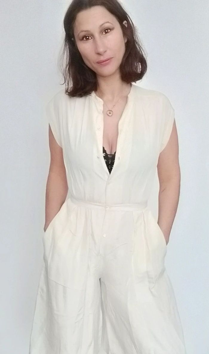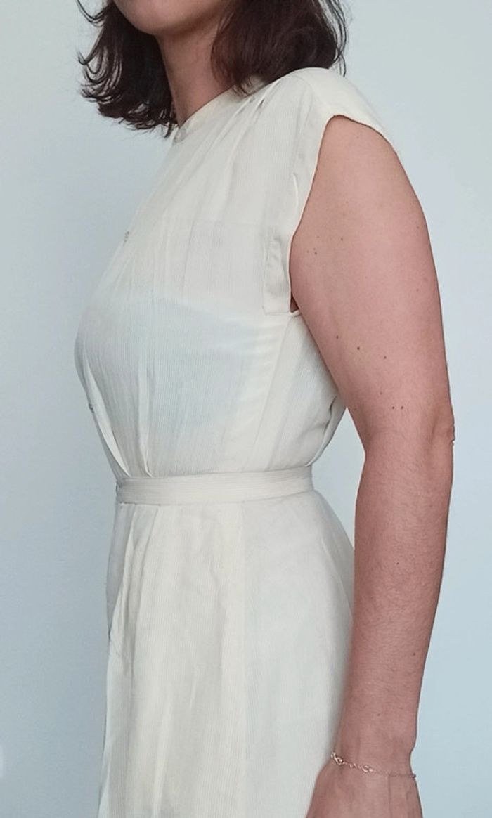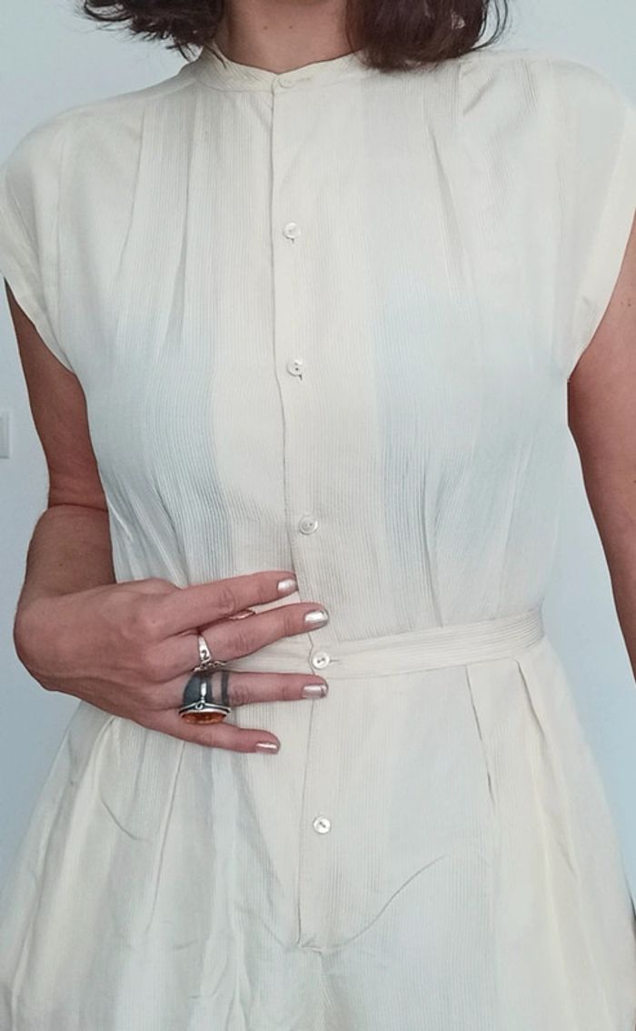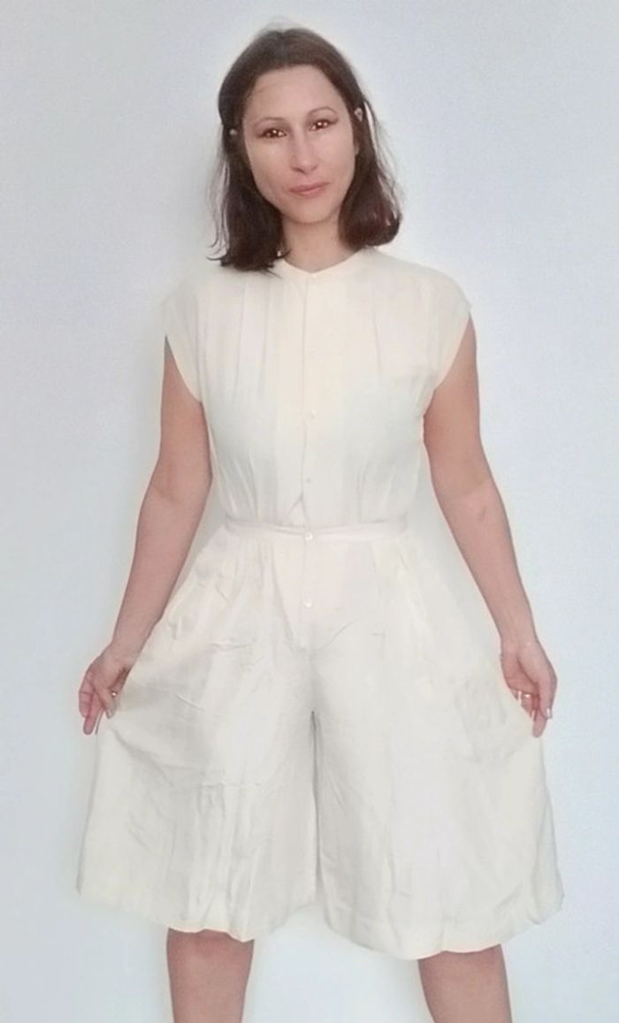 #vintage combinaison cintrée, boutonnée devant, bas short long/ jupe culotte très chic, taille inconnue: je préconise aux 36, car je fais 38/40 en bas et je suis très très serré à la taille 😅 pour le bas, bien fluide et large 😉 couleur crème, rayée, bon état mais grand âge 😂 #pepite #pepitevintage #combivintage #combivintage3436 #combijupeculotte #combijupeculotte36 #jupeculottevintage #vintage36 #combivintage36 #combichic36 #poupoupidou36