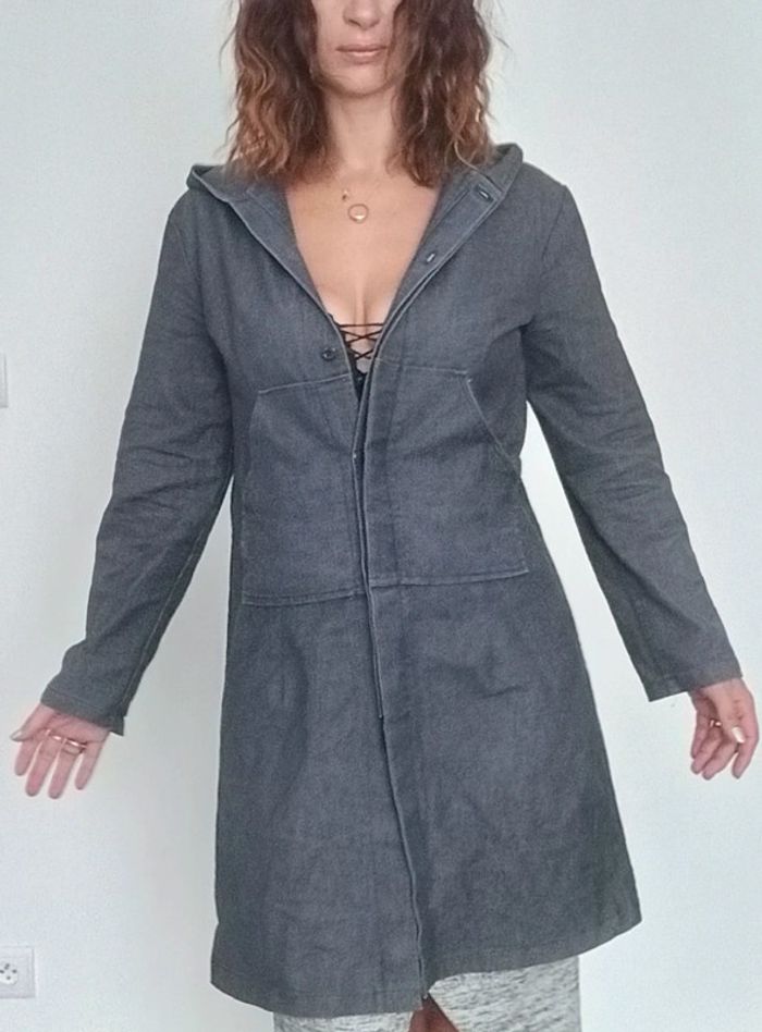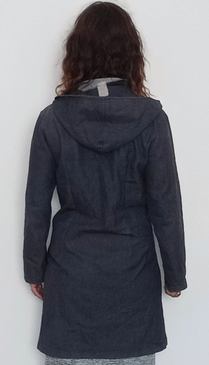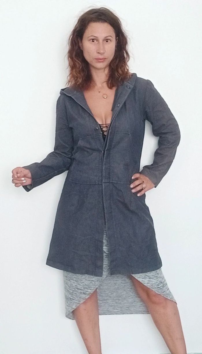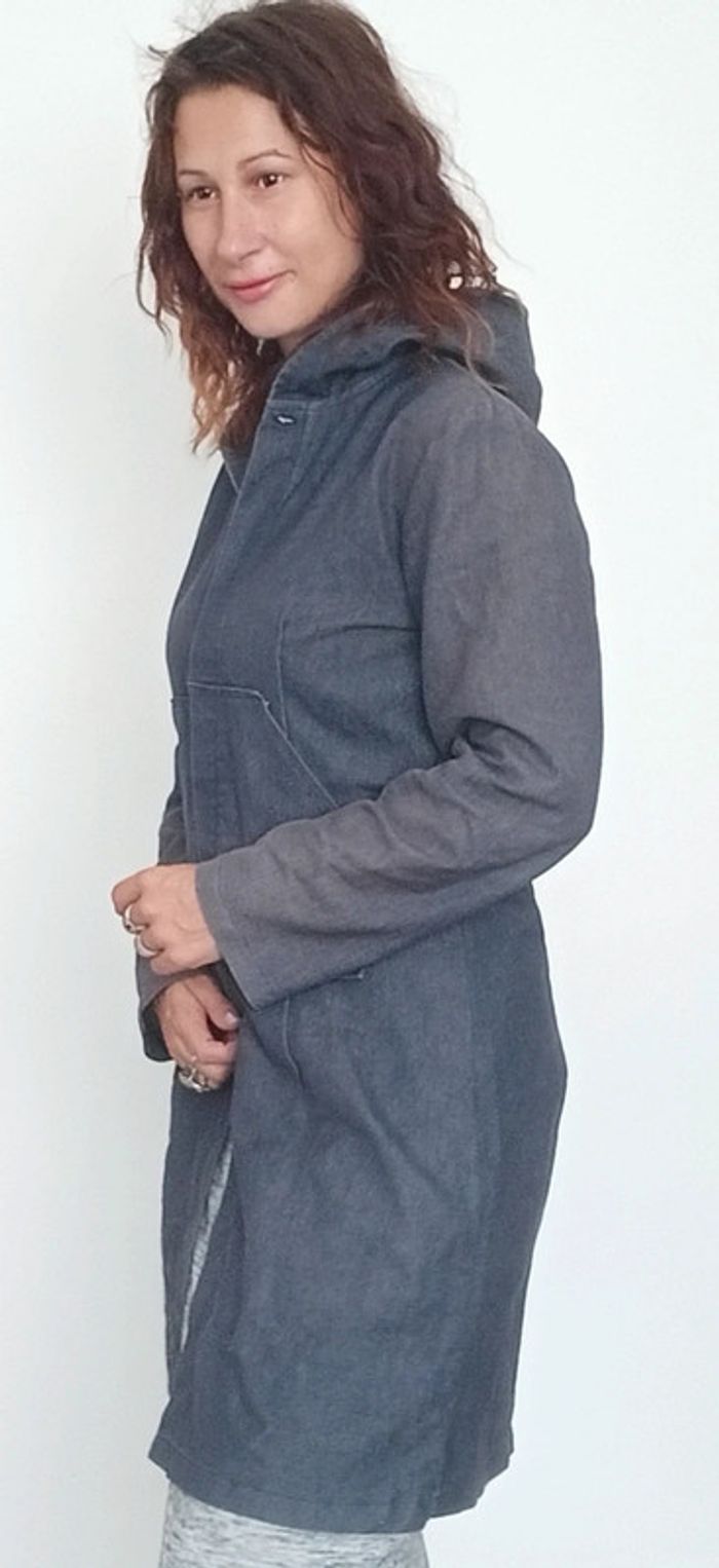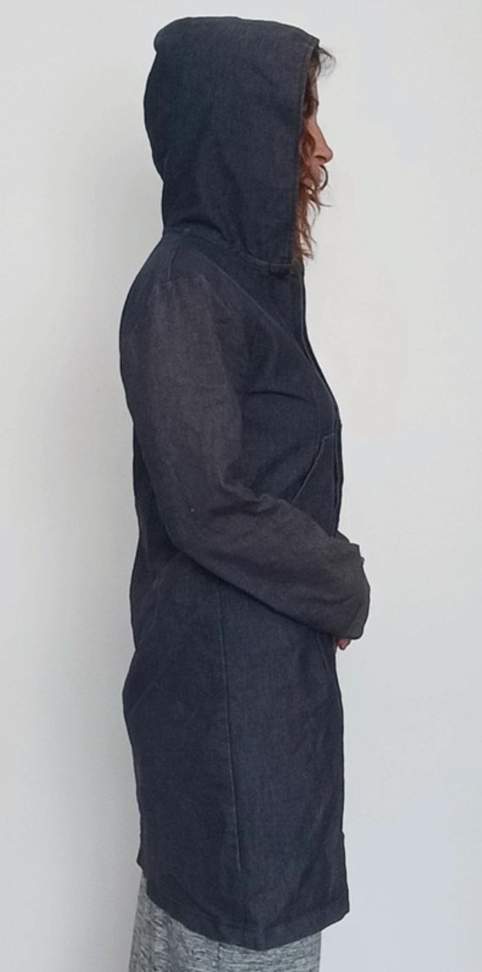 #vintage veste style jeans mais souple ( mélange de coton/ elastane, je pense)a capuche longueur trois quart facile à porter, bon état mais couleur fanée aux manches #vestetroisquart #vestetroisquart38 #vestetroisquart3840 #vestelongue #vestejeanslongue #vestelongueacapuche #vestevintage38