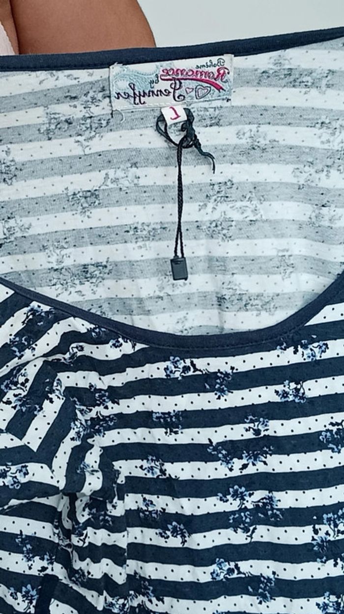 Taille s, décolleté féminin arrondi, matière t shirt confortable, doublée, haut marinière fleurie, neuve #robe36 #robecourte36 #robemariniere36 #robemarine36 #robeete36 #robepinup36 #poupoupidou36