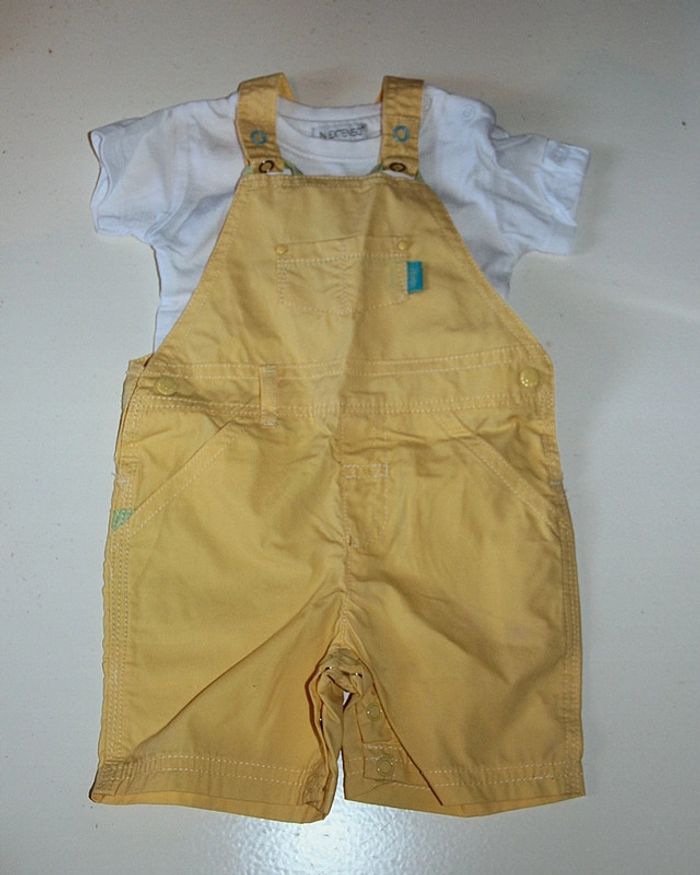 Ensemble salopette jaune et tee shirt, très peu porté en très bon état. Taille 6 mois #jessybibou6mois9mois