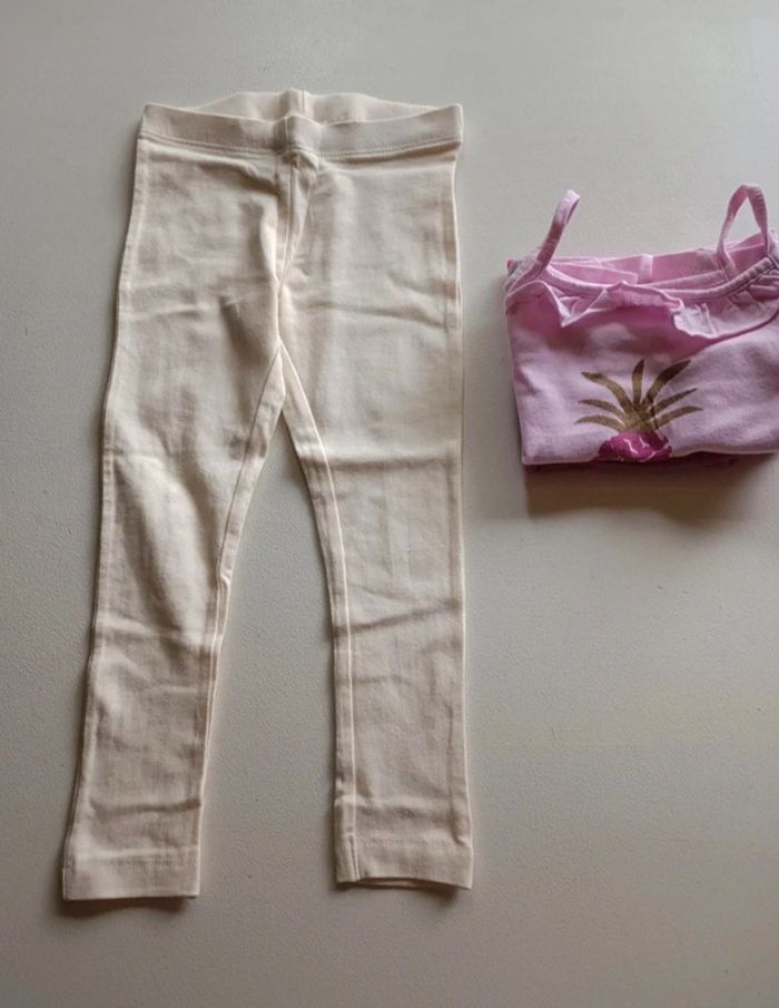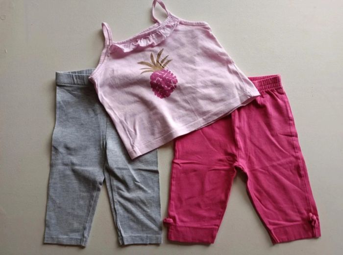 Lot en très bon état : - 1 legging court gris Orchestra - 1 legging court rose Gémo - 1 débardeur Kimadi 🍍 - 1 legging beige long Kiabi, neuf (taille 3 ans) #jessybibou24mois2ans