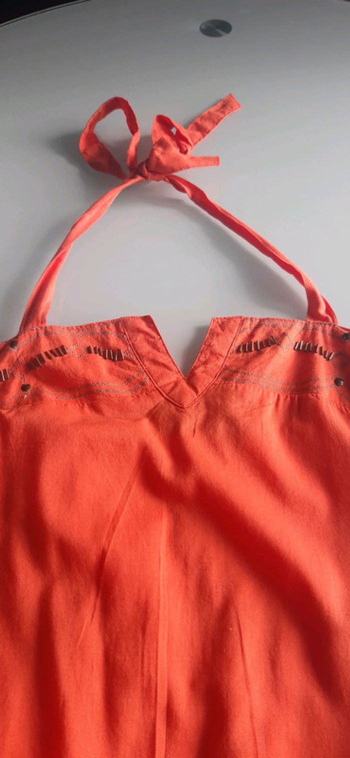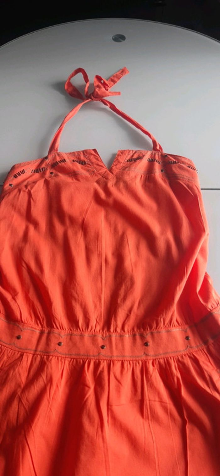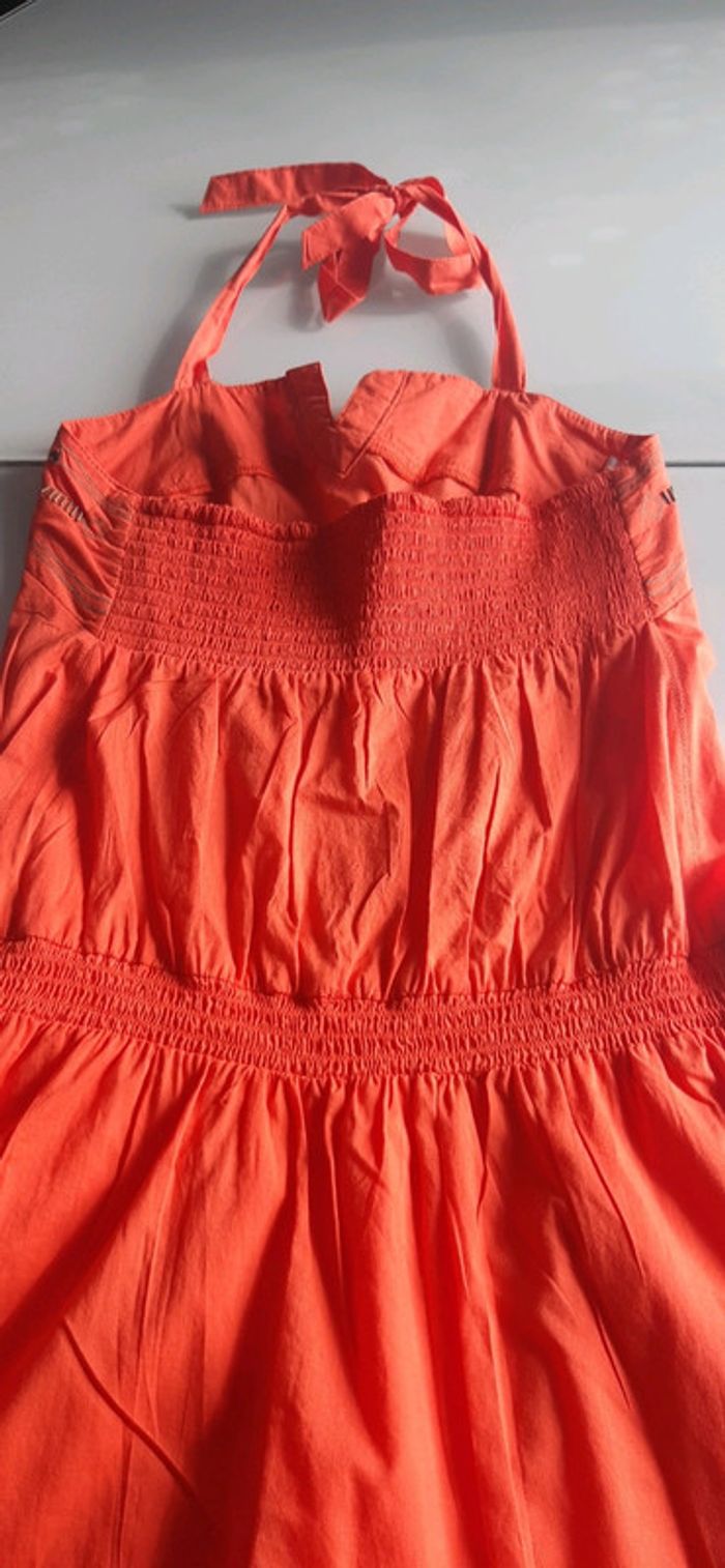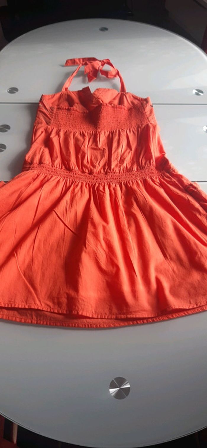Dos nu et épaules découvertes, lien à nouer autour du cou 2 poches plaquées et doublure donc non transparente. Etiquette de taille coupée mais correspond à un 36 #vanessavadfemme36 #promod36 #robedete36 #robeorange36 #robecourte36