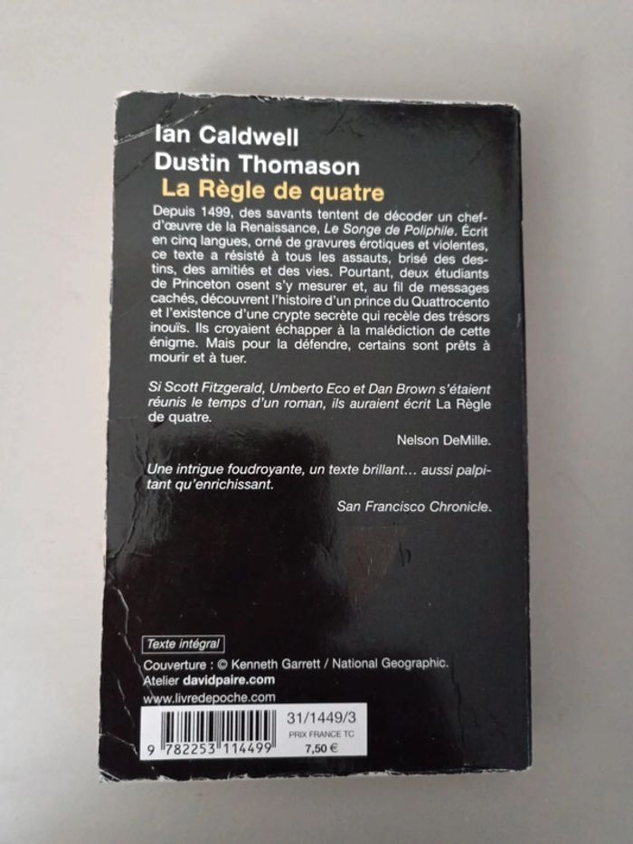 Voici le lien pour voir tous mes livres : #romain75015_Livres. Poids : 222 grammes. Prix neuf : 7,5 euros. Thriller la règle de quatre Ian Caldwell Dustin thomason