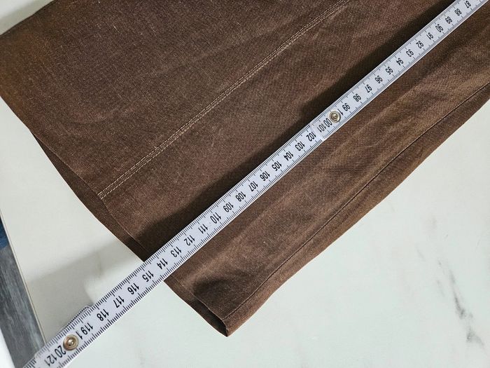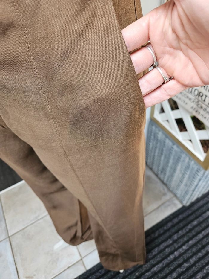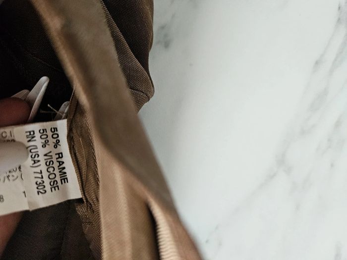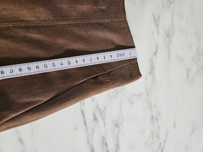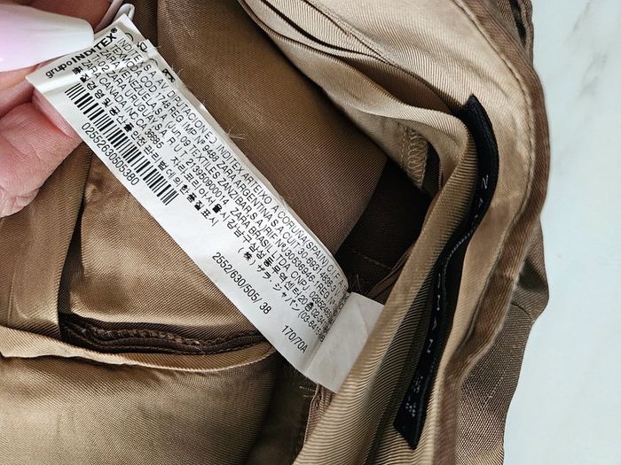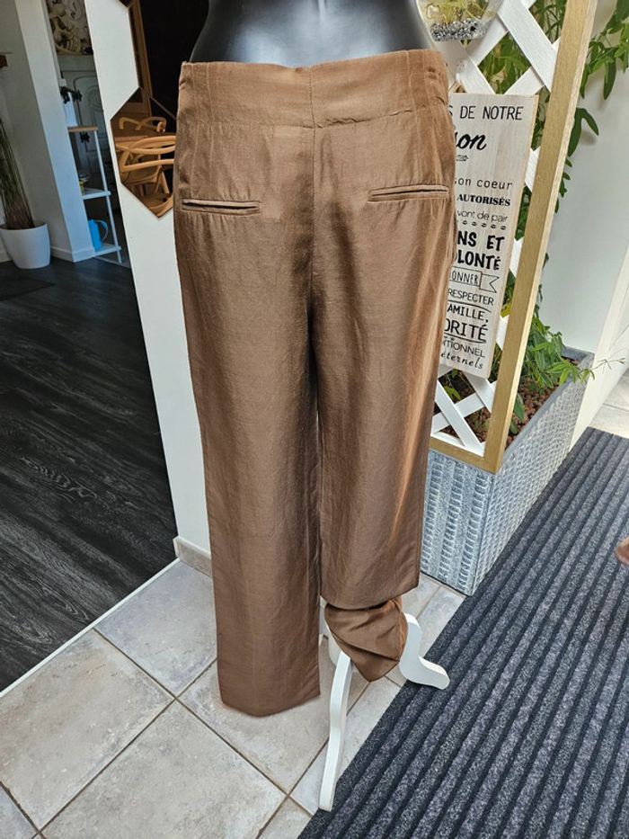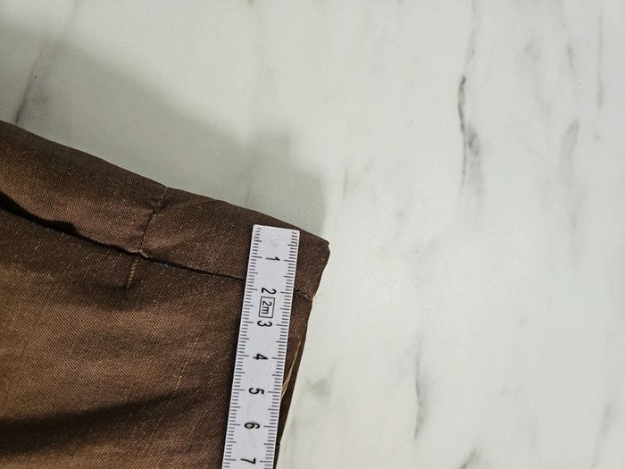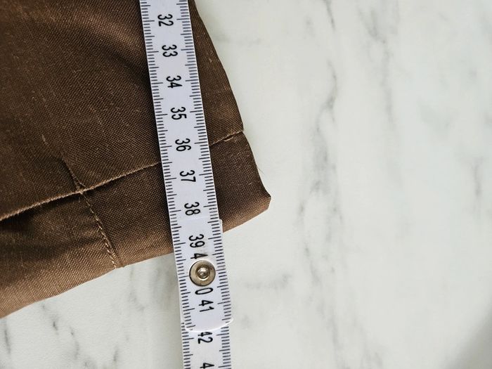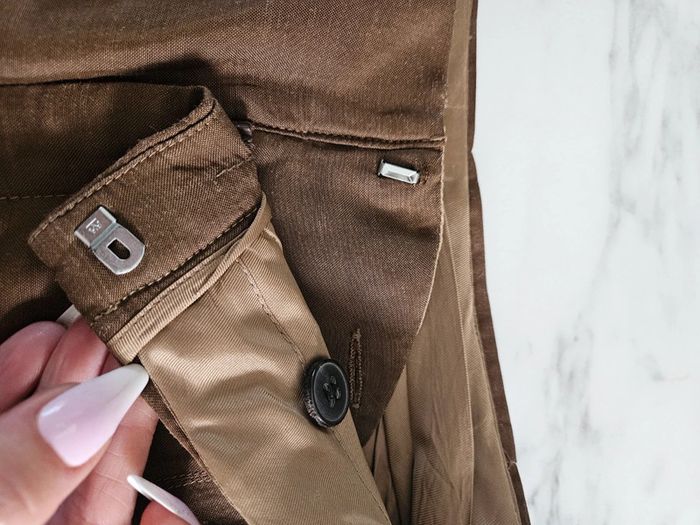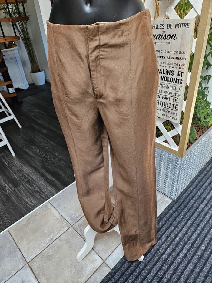 Porté en bon état. Il est très long les dimensions se trouvent sur les photos. Pas de trous et pas de tâche. Juste l'attache que l'on ferme un peu décousue mais minime que je viens de remarquer mais ne se voit pas du tout porté. Visible sur photos aussi. Matière légère et agréable à porté. Marron plus foncé comme le pantalon à plat