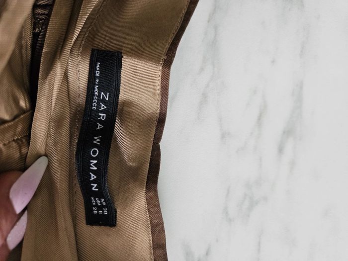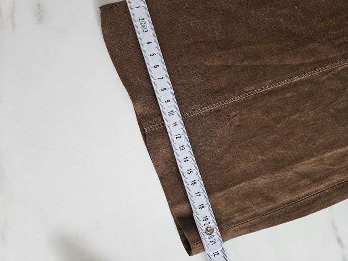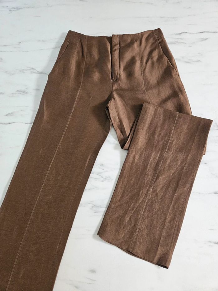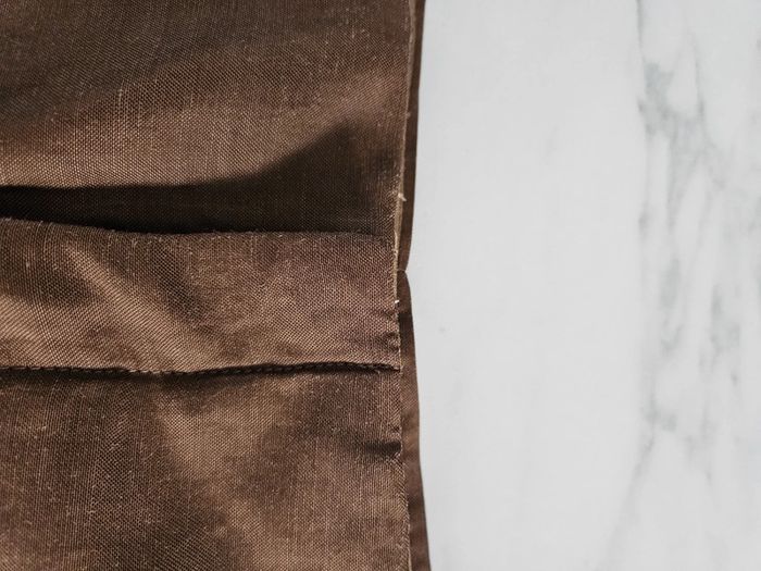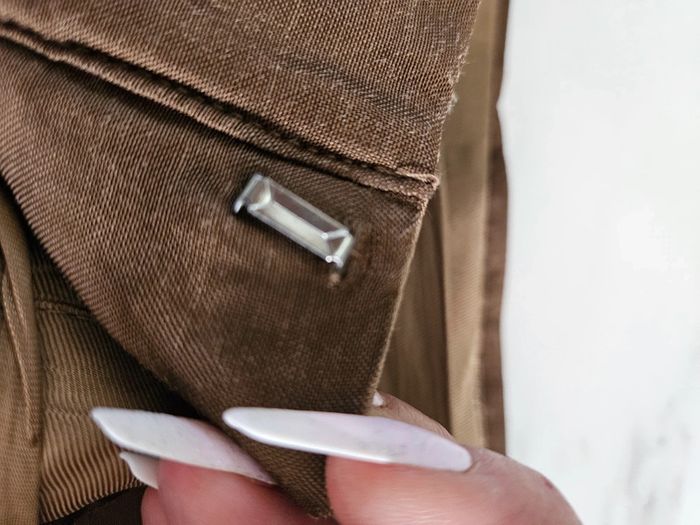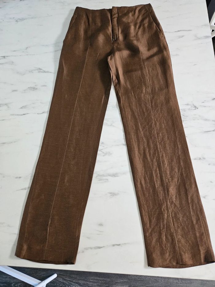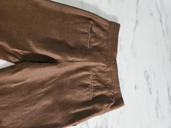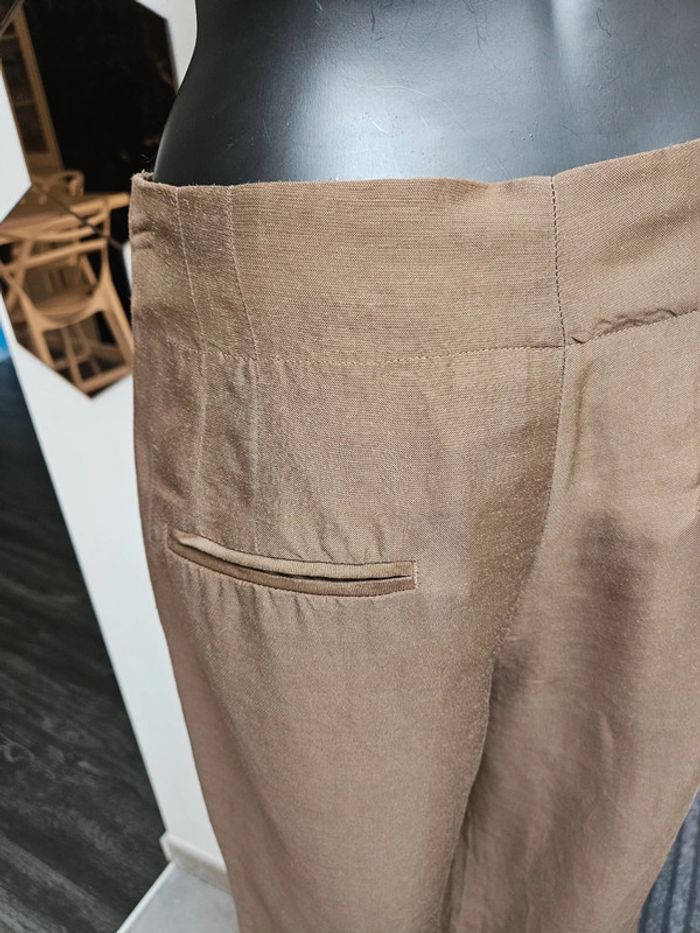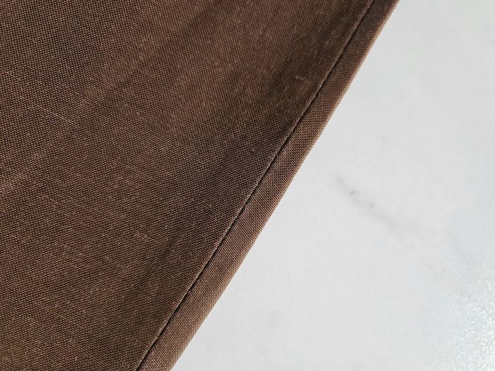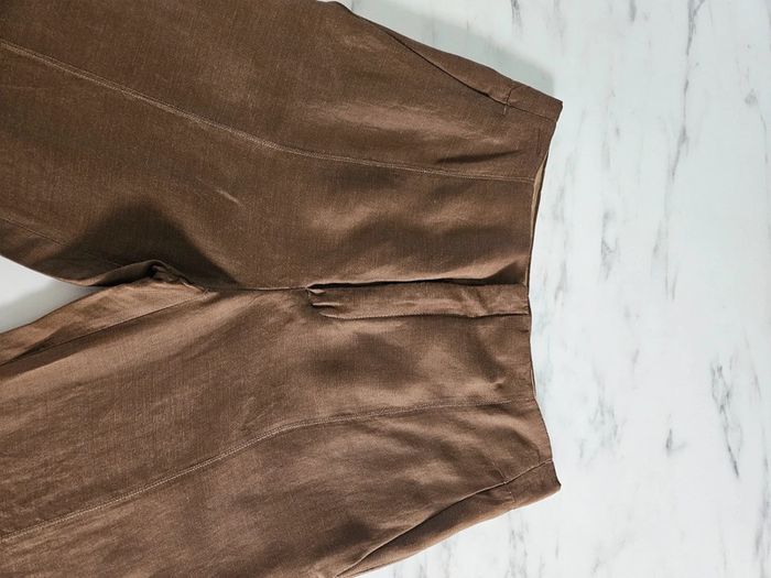 Porté en bon état. Il est très long les dimensions se trouvent sur les photos. Pas de trous et pas de tâche. Juste l'attache que l'on ferme un peu décousue mais minime que je viens de remarquer mais ne se voit pas du tout porté. Visible sur photos aussi. Matière légère et agréable à porté. Marron plus foncé comme le pantalon à plat