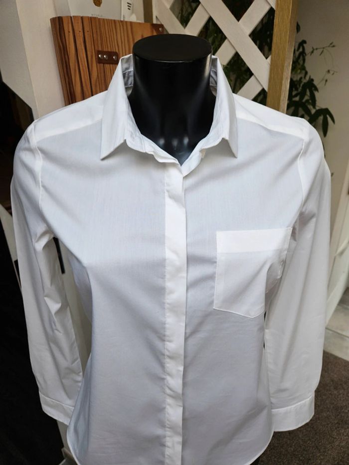 Chemise blanche ajustée. Peut convenir pour une taille L. Elle est en état irréprochable et les dimensions se trouvent sur les photos