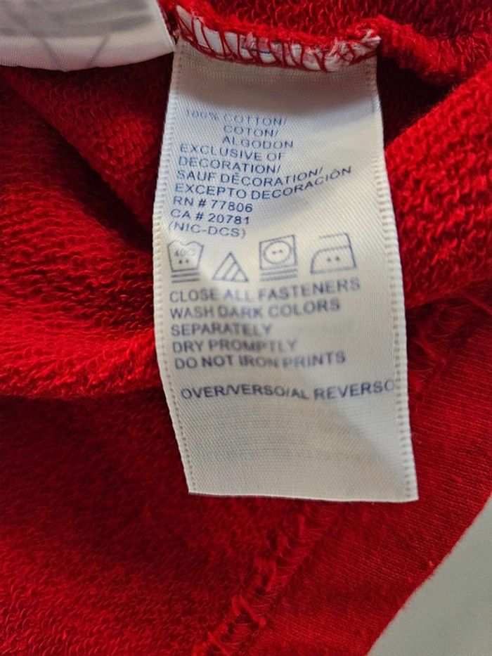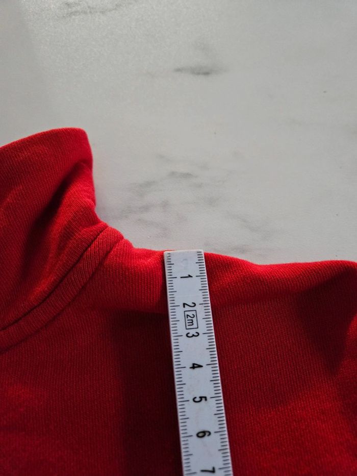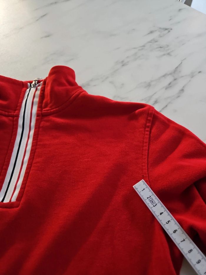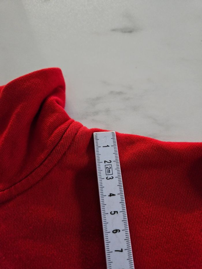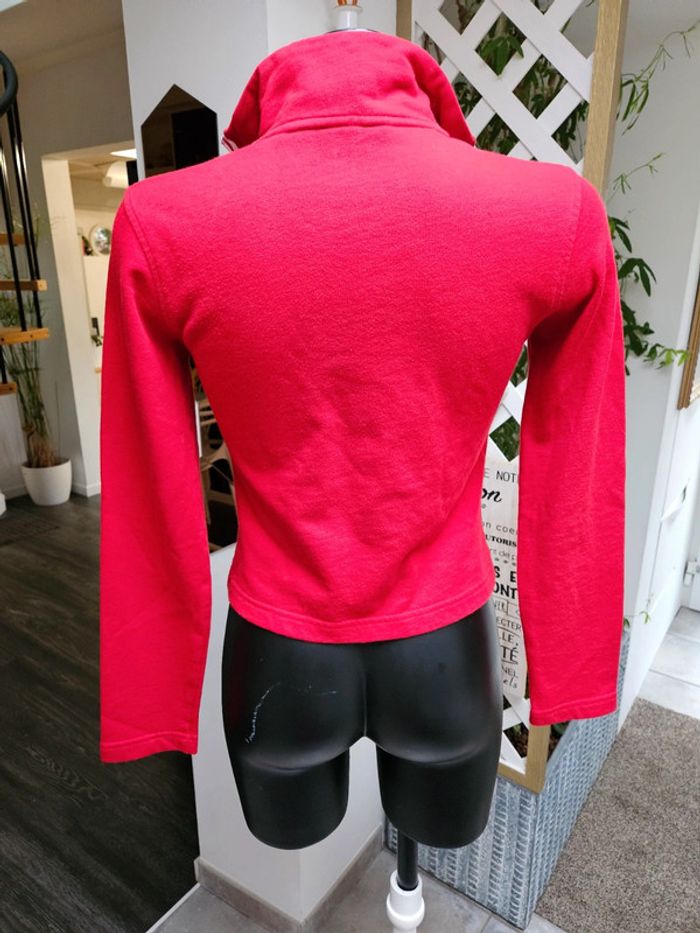 Pull en coton rouge col montant à tirette. Pour taille XS. S dimensions sur les photos. Il est en parfait état juste infime accroc que je viens de remarquer et visible sur dernière phoho mais ce n'est pas un trou. Il est mixte et le rouge est moins vif en vrai