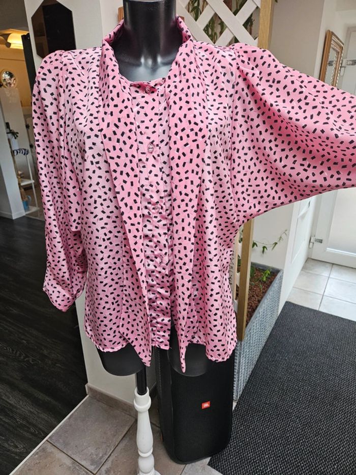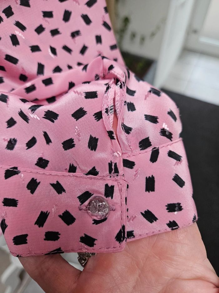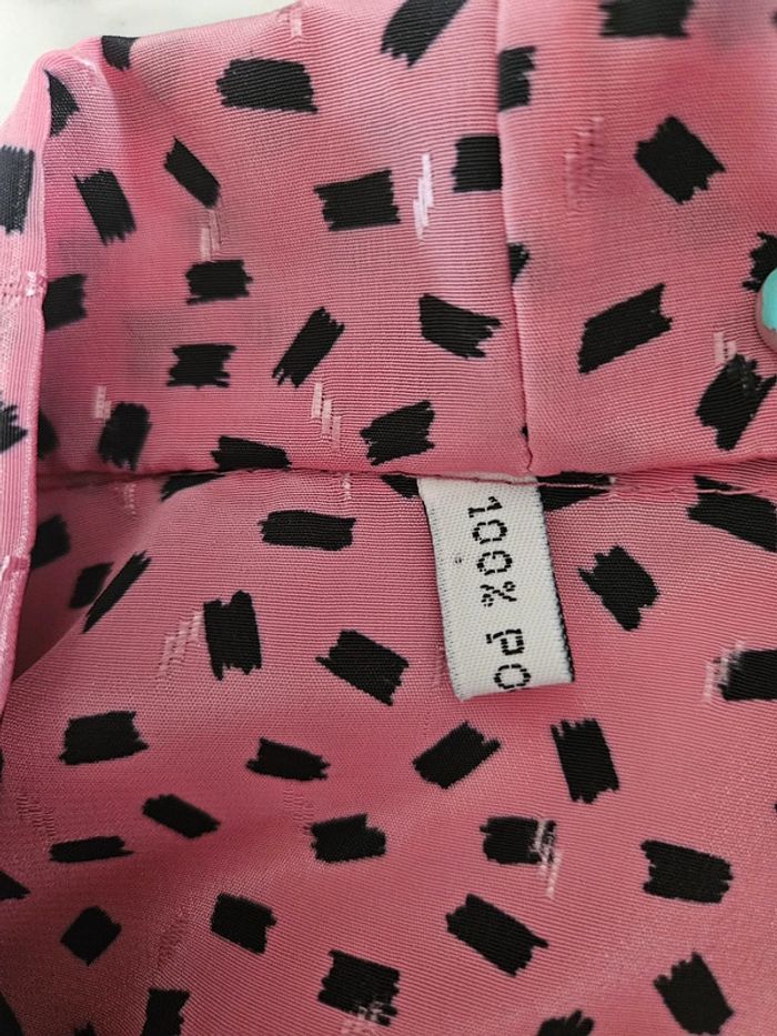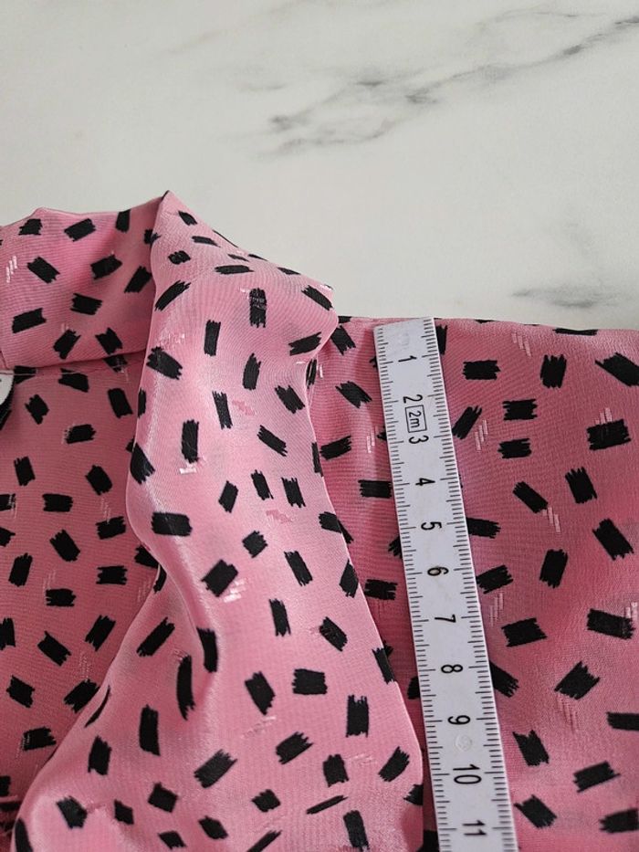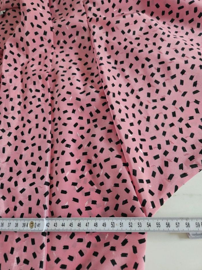 Porté mais il reste en parfait état. Il manque par contre un bouton visible sur photo. Matière légère et agréable. Rose à motifs noir. Pas d'étiquette de taille mais les dimensions se trouvent sur les photos