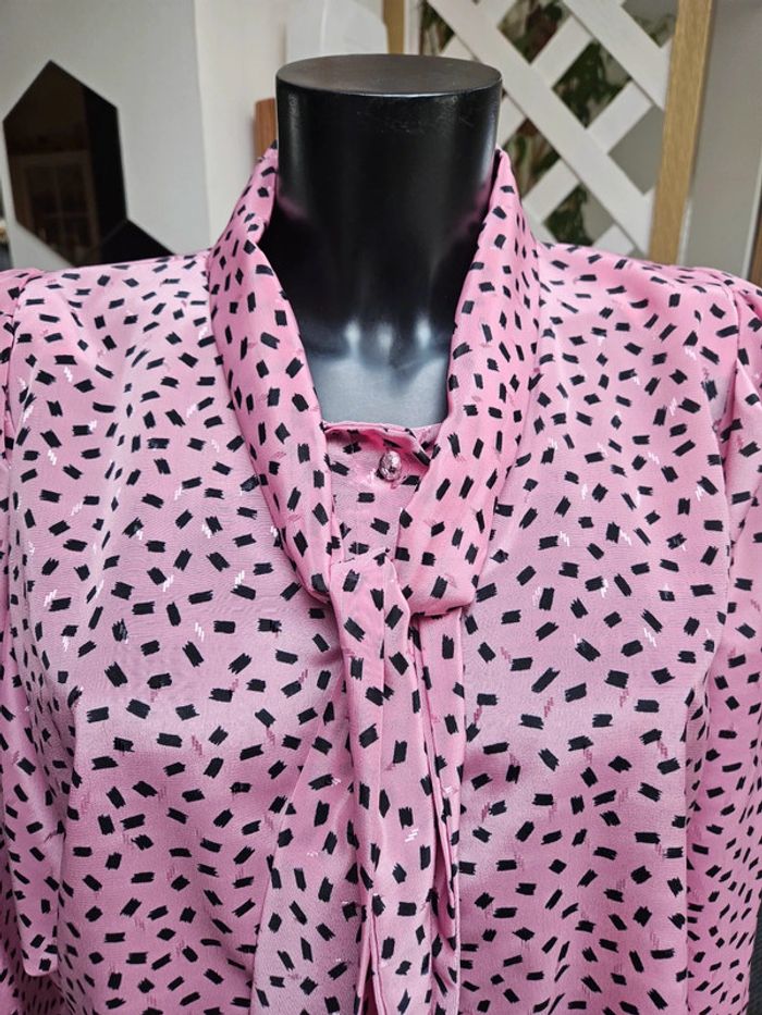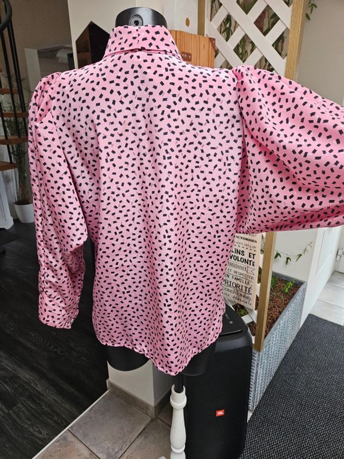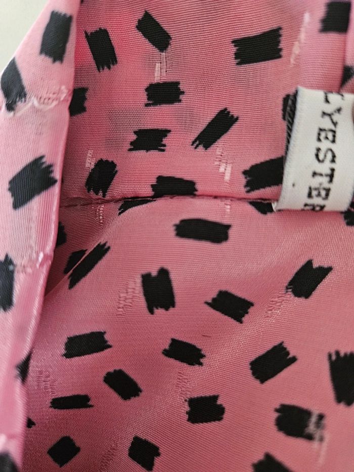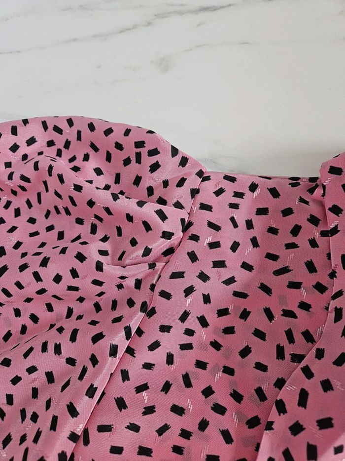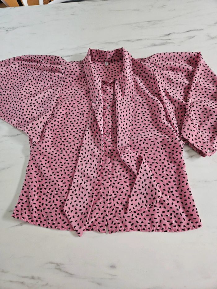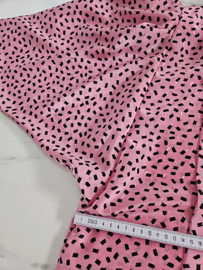 Porté mais il reste en parfait état. Il manque par contre un bouton visible sur photo. Matière légère et agréable. Rose à motifs noir. Pas d'étiquette de taille mais les dimensions se trouvent sur les photos