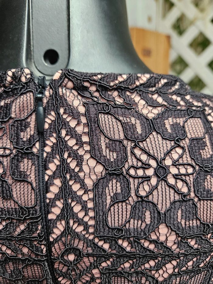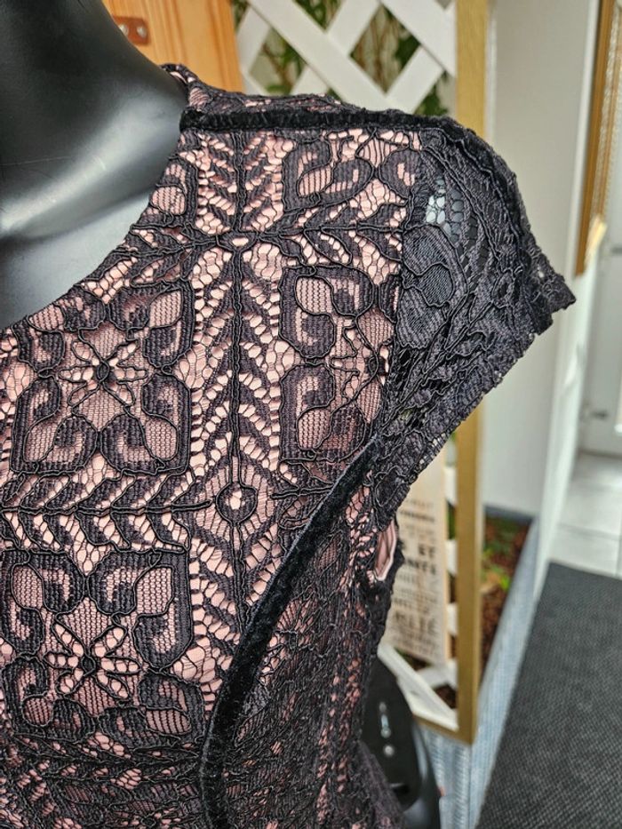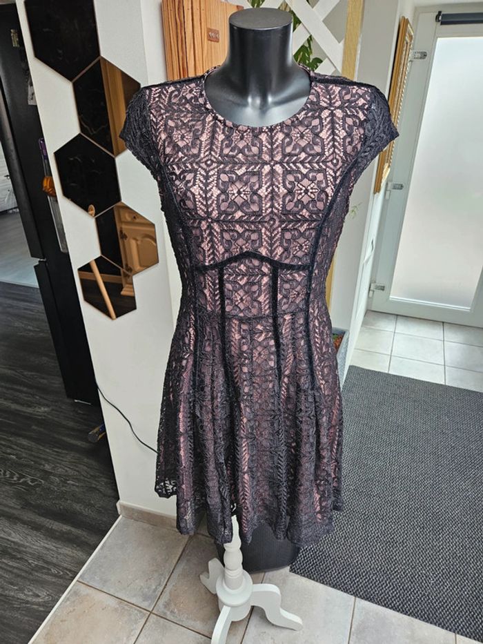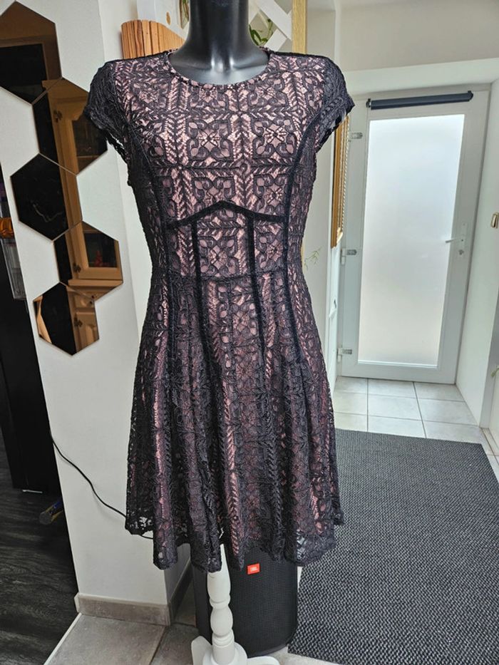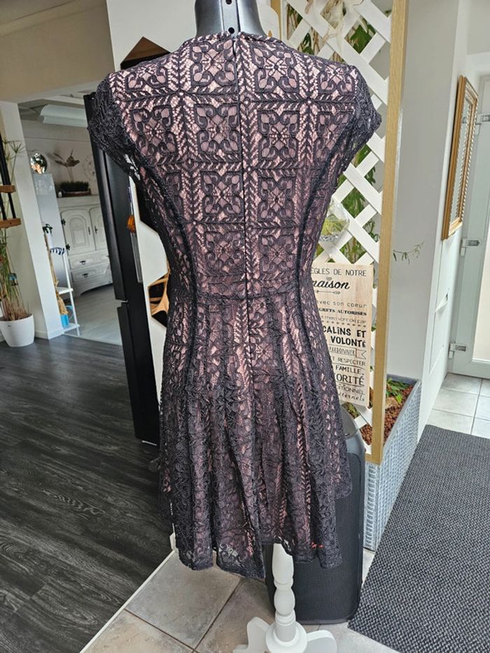 Robe neuve. Dentelle noir et doublure rose. Très chic. Près du corps sur le dessus et évasée sur le bas. Dimensions sur les photos