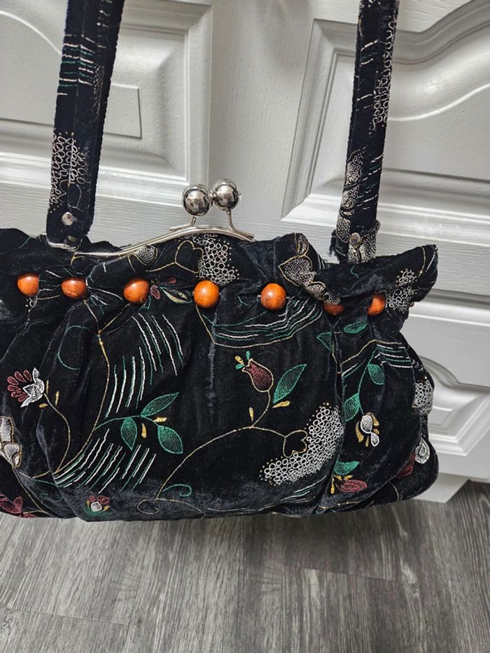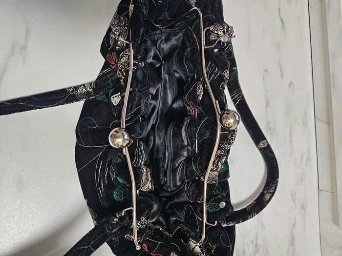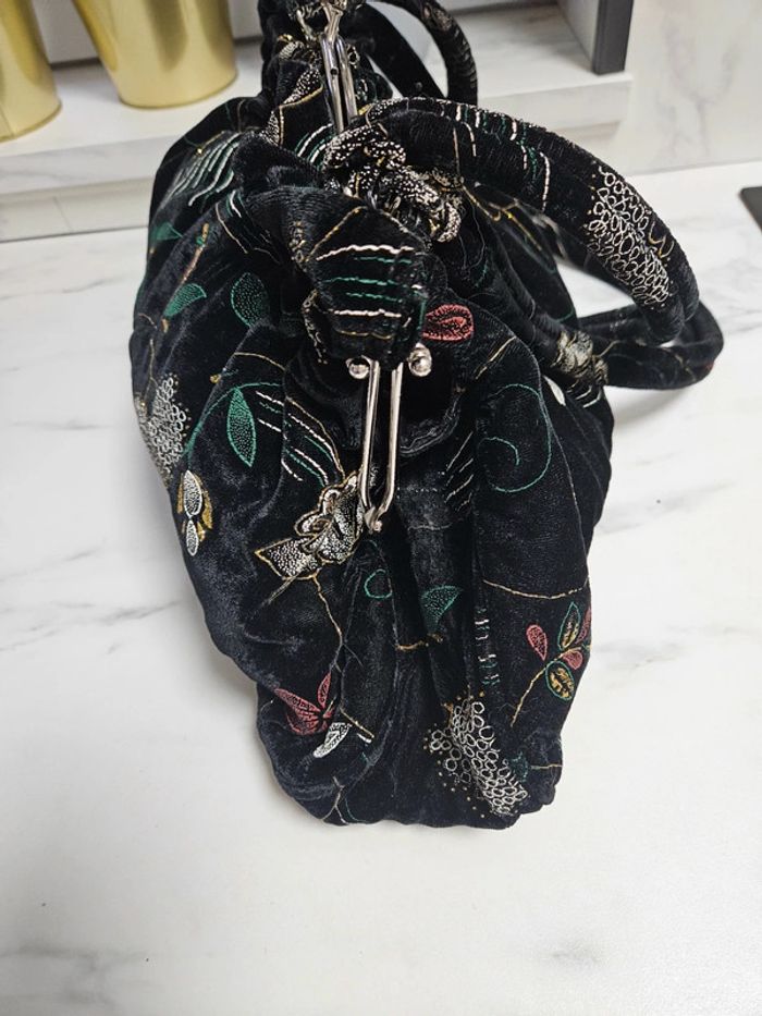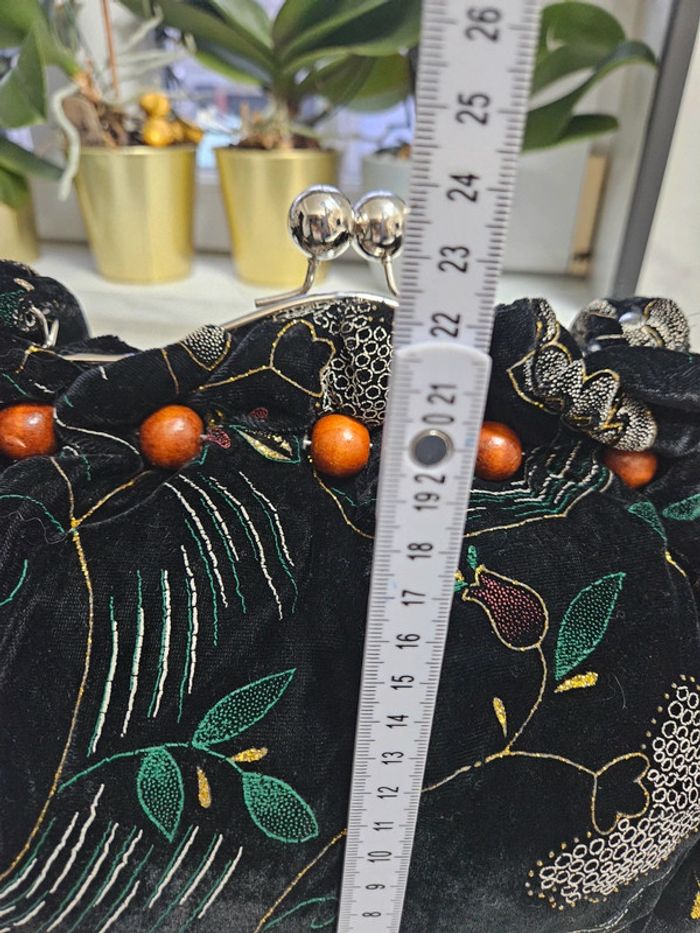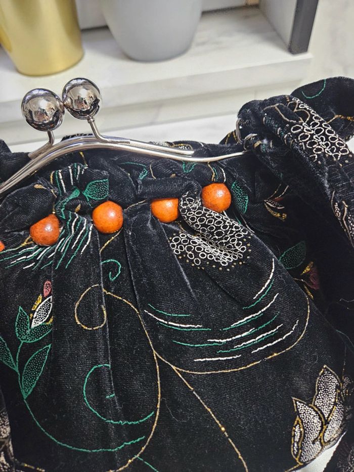 Sac à main en forme de bourse ainsi que la fermeture Velours noir à motifs. Utilisé mais il reste en très bon état. Dimensions sur les photos