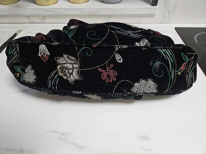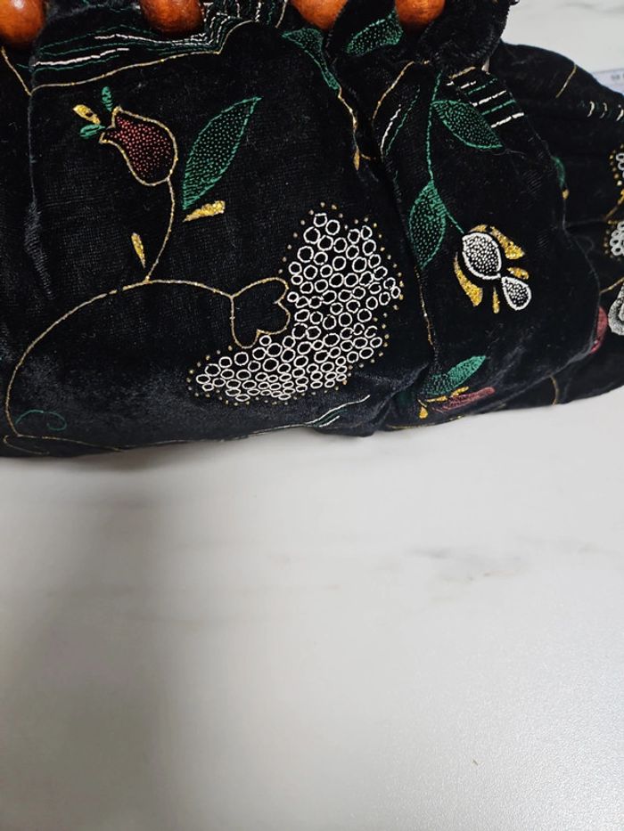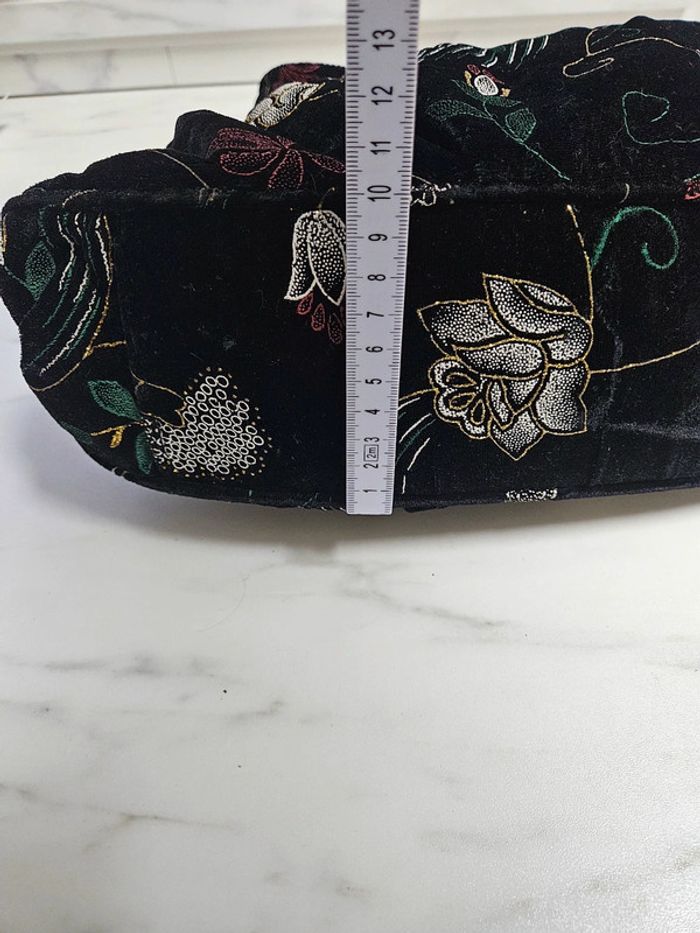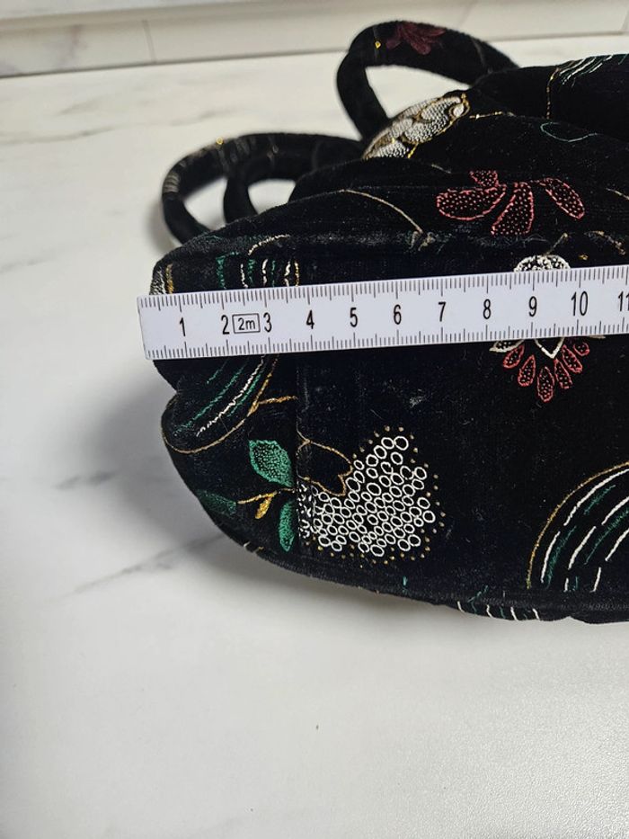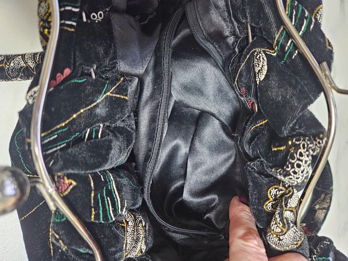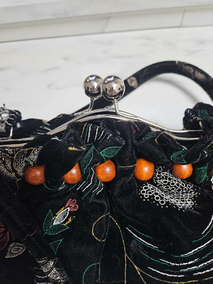 Sac à main en forme de bourse ainsi que la fermeture Velours noir à motifs. Utilisé mais il reste en très bon état. Dimensions sur les photos