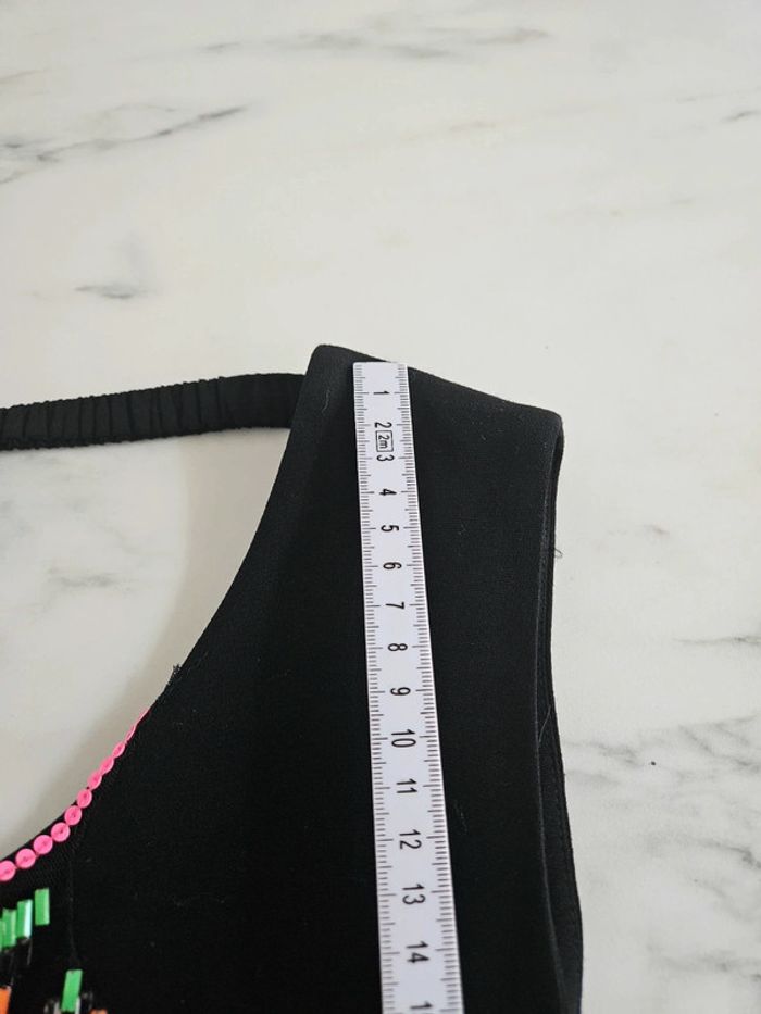 Portée mais elle reste en très bon état. Je fais un 38 et j'y suis à l'aise. Agréable à porter l'intérieur est satinée ainsi que les côtés Décos fluo sur le devant. Par précaution les dimensions se trouvent sur les photos