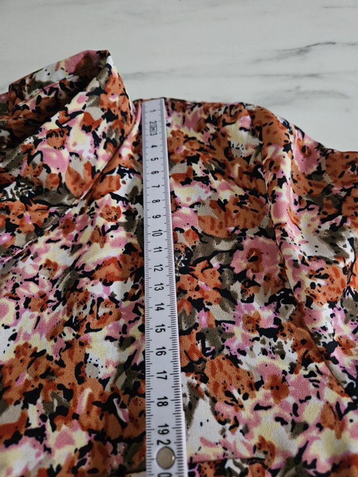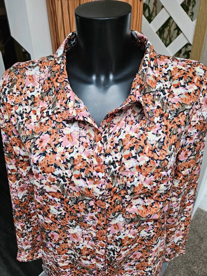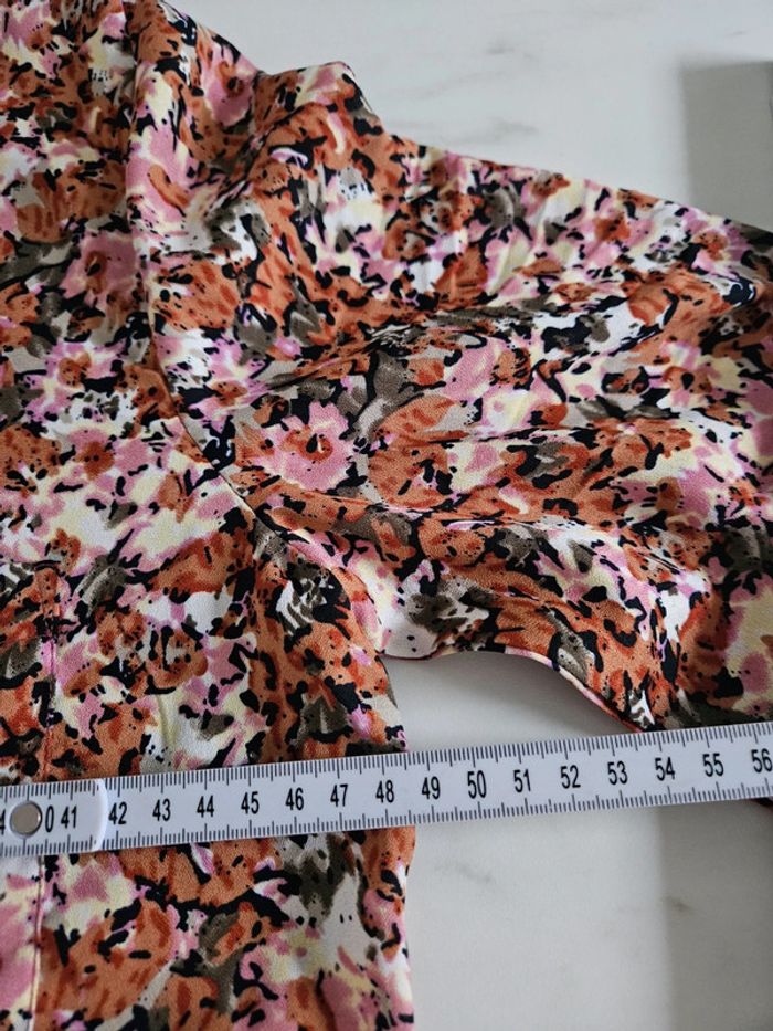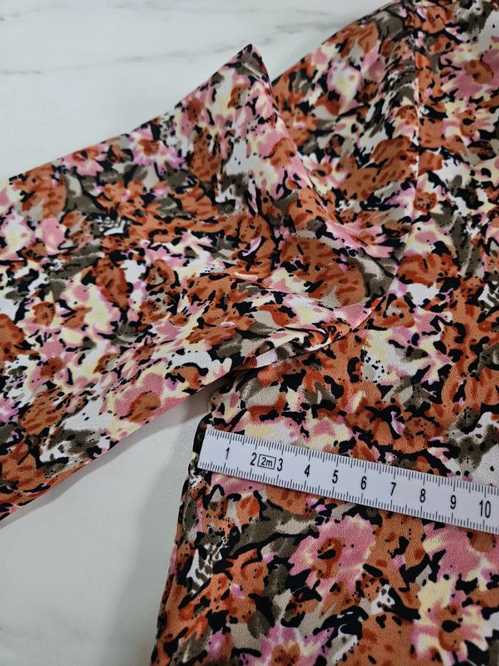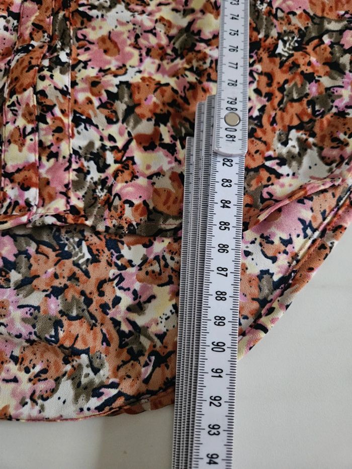 Dans les tons marron et rosé. Il n'a jamais été porté. Plus long derrière que devant. Matière légère et fluide. Dimensions sur mes photos