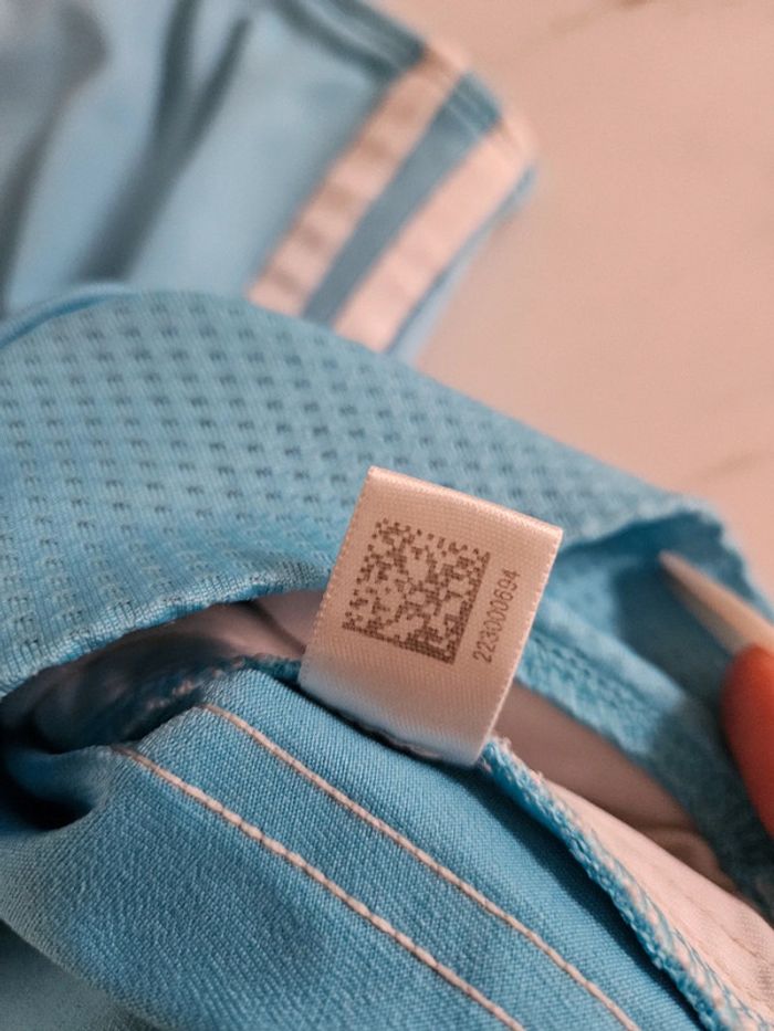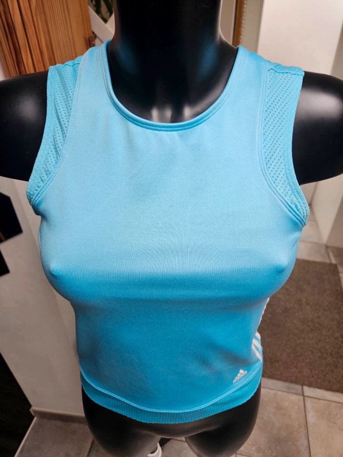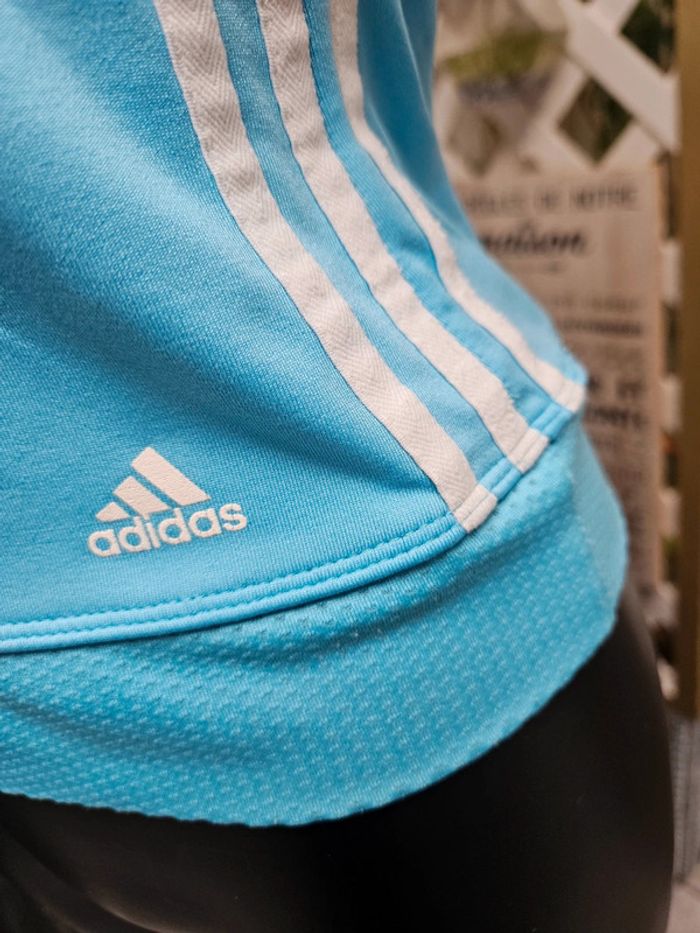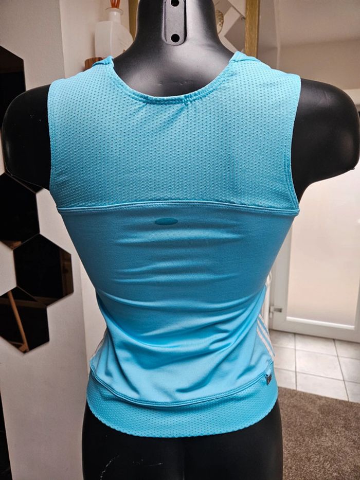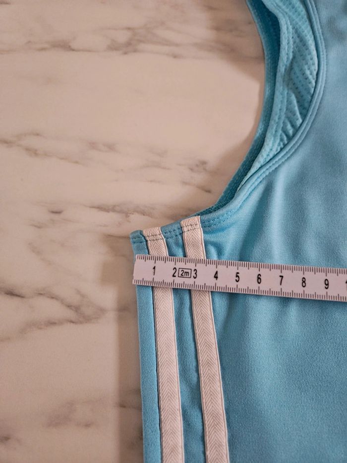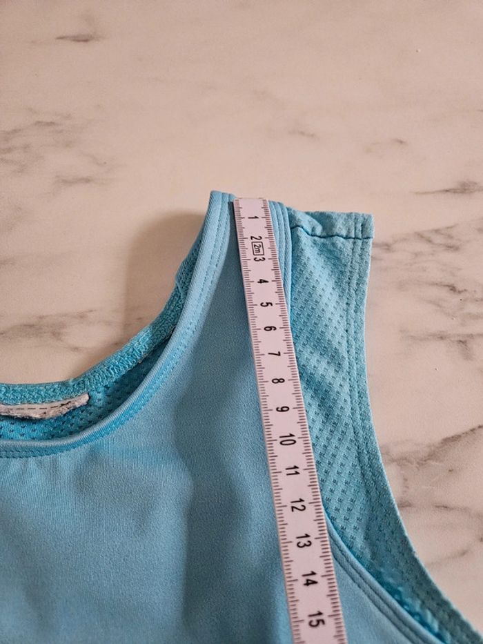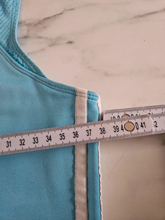 Bleu turquoise en matière lycra. Plis d'étiquette de taille mais correspond à un S via les dimensions sur photos mais peut convenir pour un M. Porté en bon état
