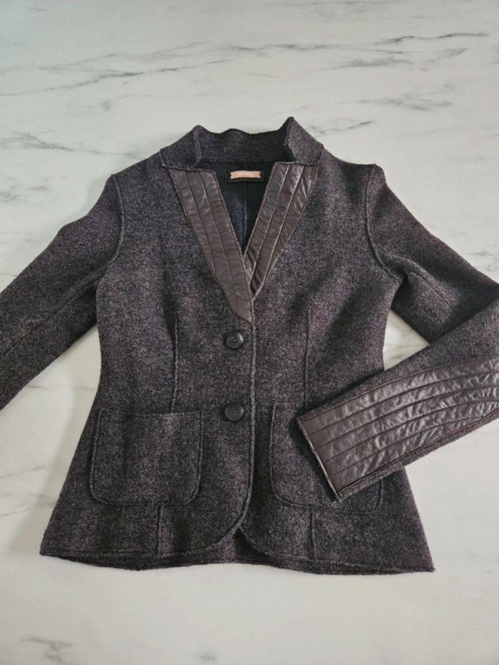 Veste style blazer en laine. Gris anthracite et marron. Elle est en état impeccable. La taille ne correspond pas. Les dimensions se trouvent sur les photos. Sera moulante pour un S et peut convenir pour XS