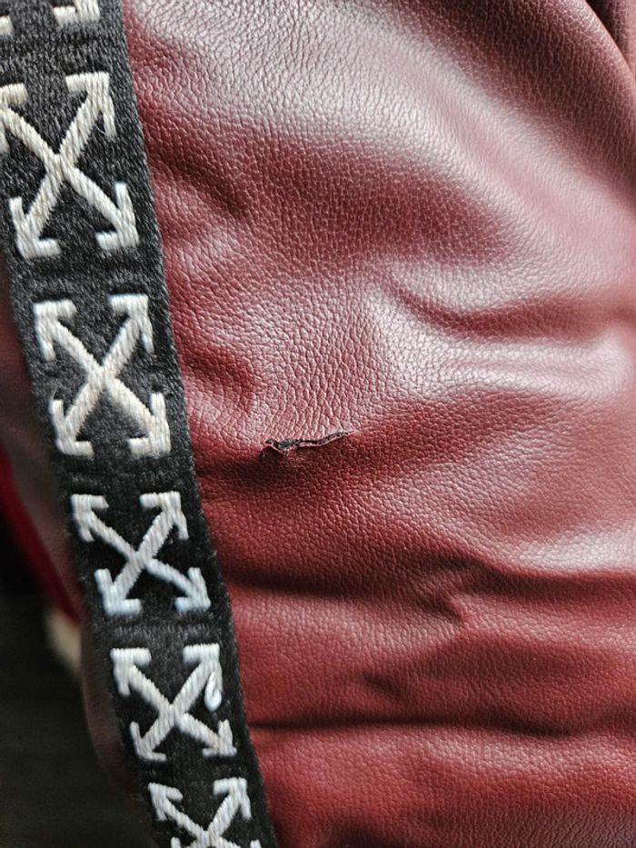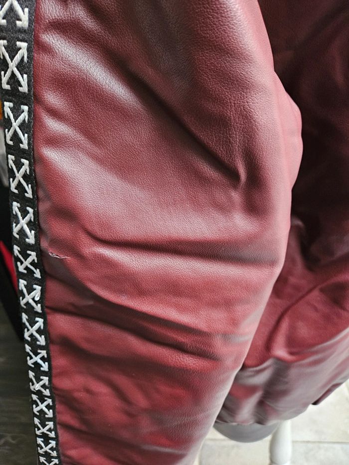 Elle est bordeaux un peu plus foncée en vrai. Portée en bon état. Accroc à la manche gauche arrière visible sur photos. Les dimensions s'y trouvent également