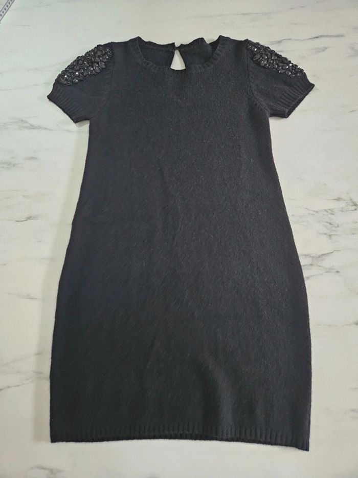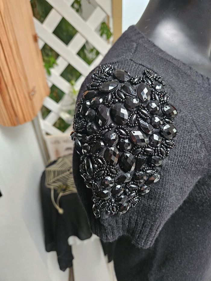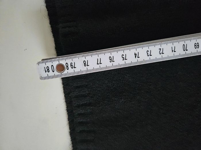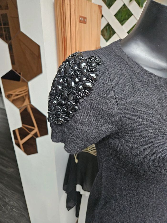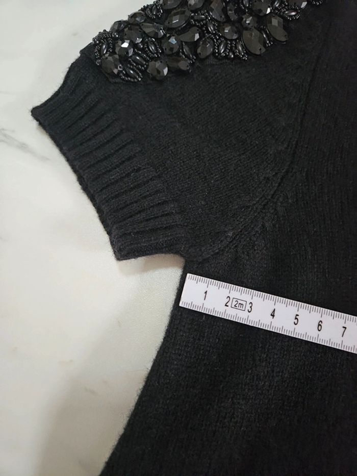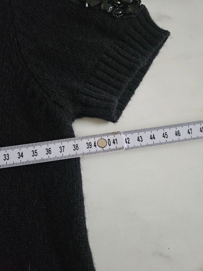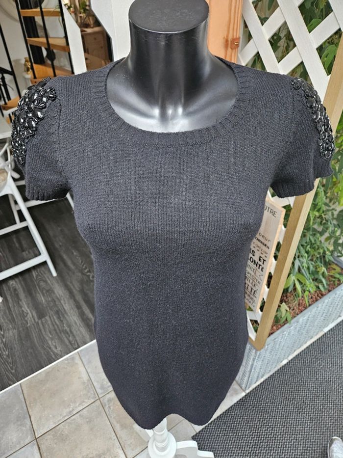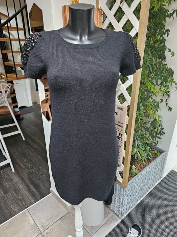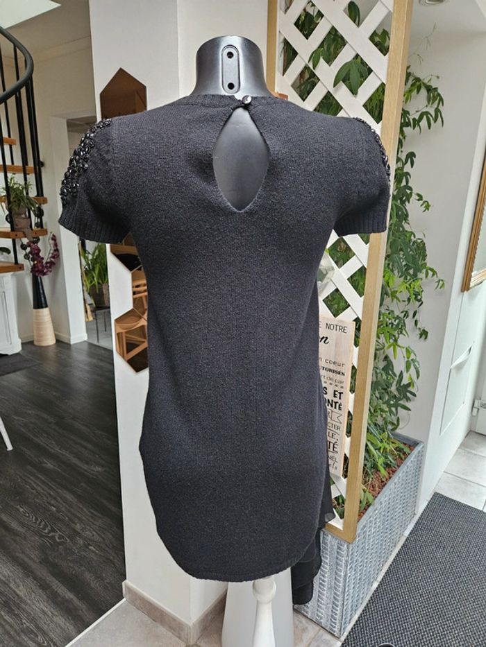 Elle est en état impeccable. Je ne sais plus d'où elle vient car j'ai coupé l'étiquette. 77% de Laine avec décos noirs sur les épaules. Dimensions sur les photos. Moulante pour un M plus ample pour un S