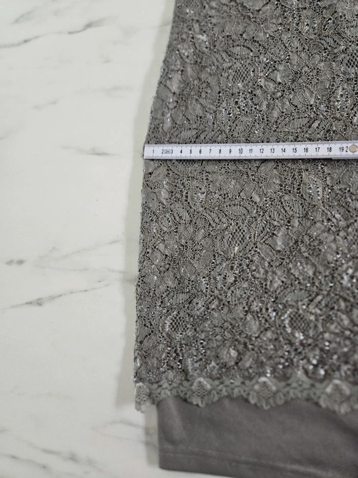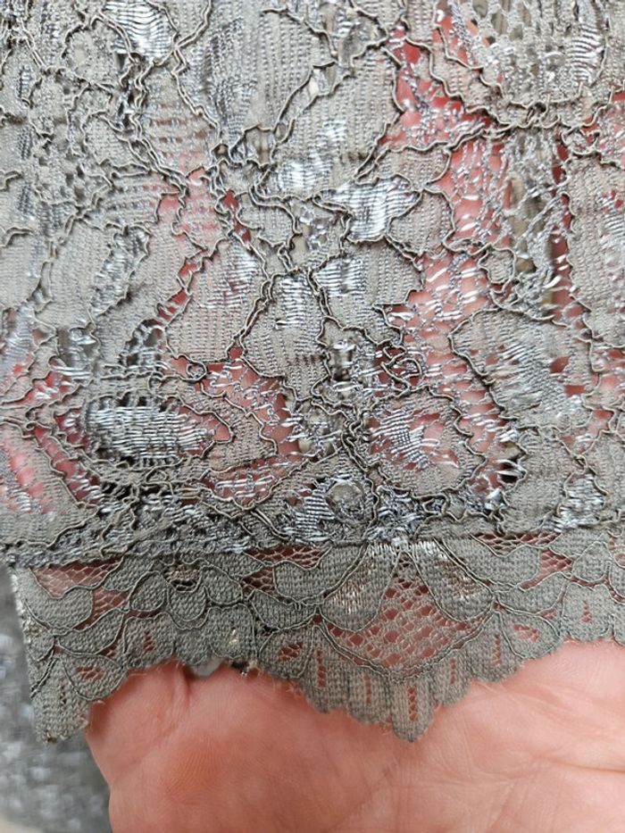 De couleur kaki un peu gris très clair toute en dentelle. En très bon état, dimensions sur les photos