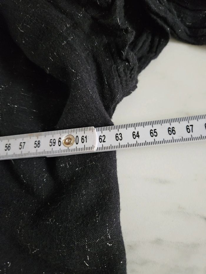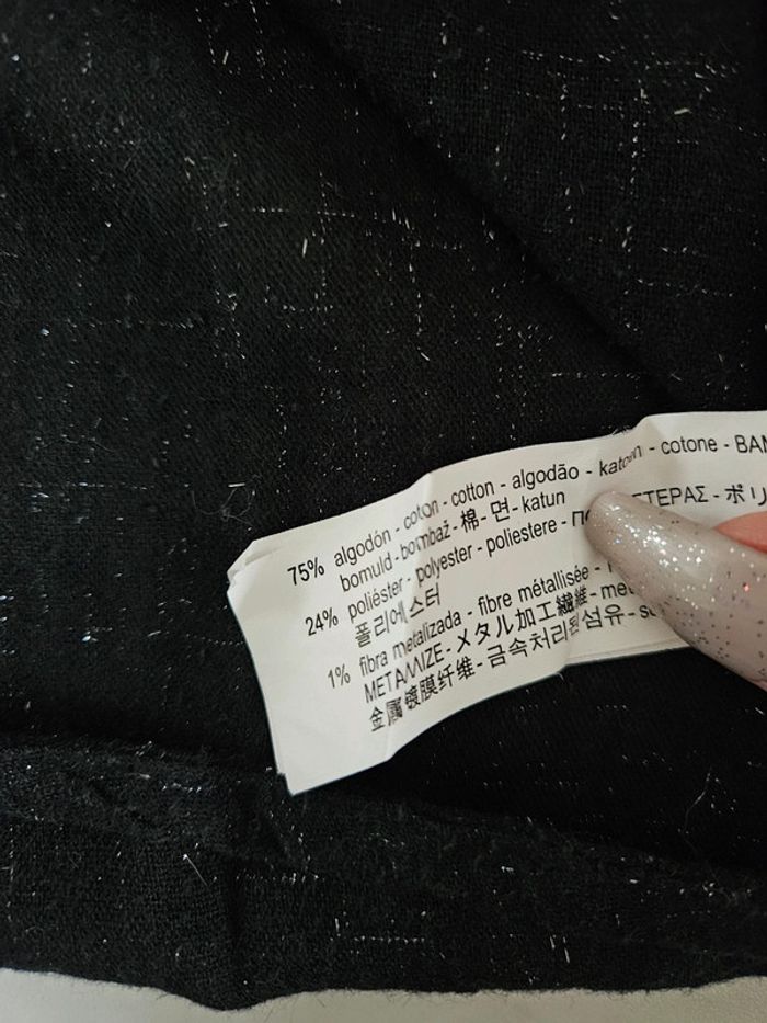 Noir avec fils argentés. C'est une XS mais ne se porte pas bien du tout pour une petite taille. Conviendrait mieux pour un L Dimensions sur les photos. En très bon état