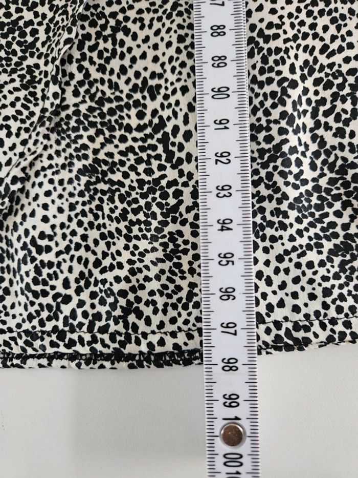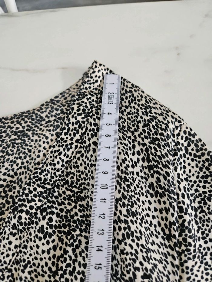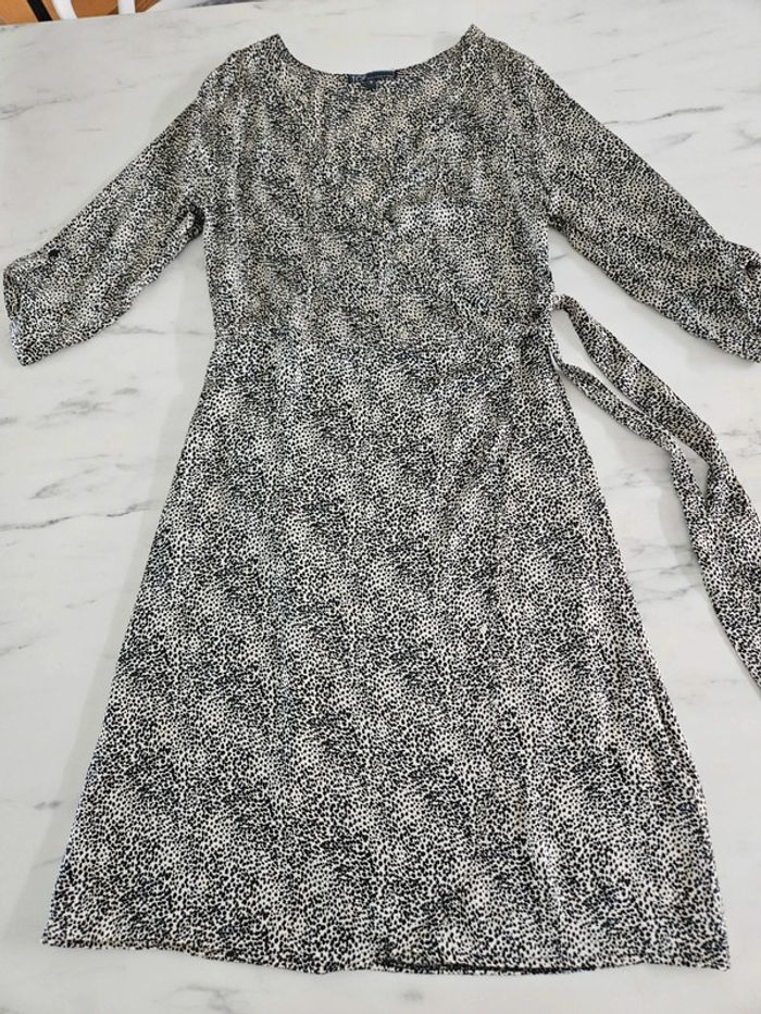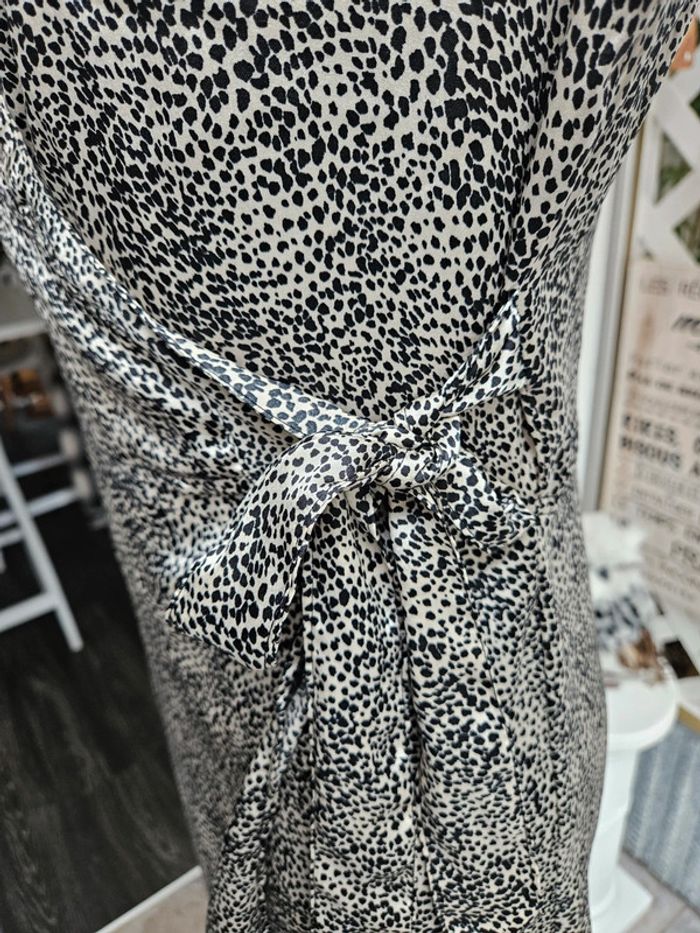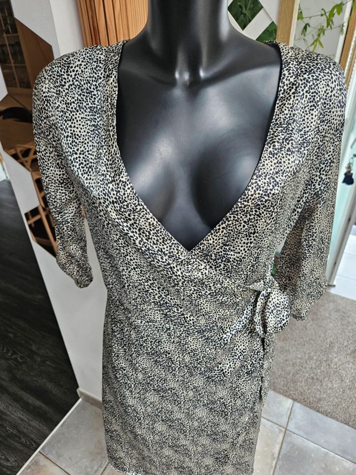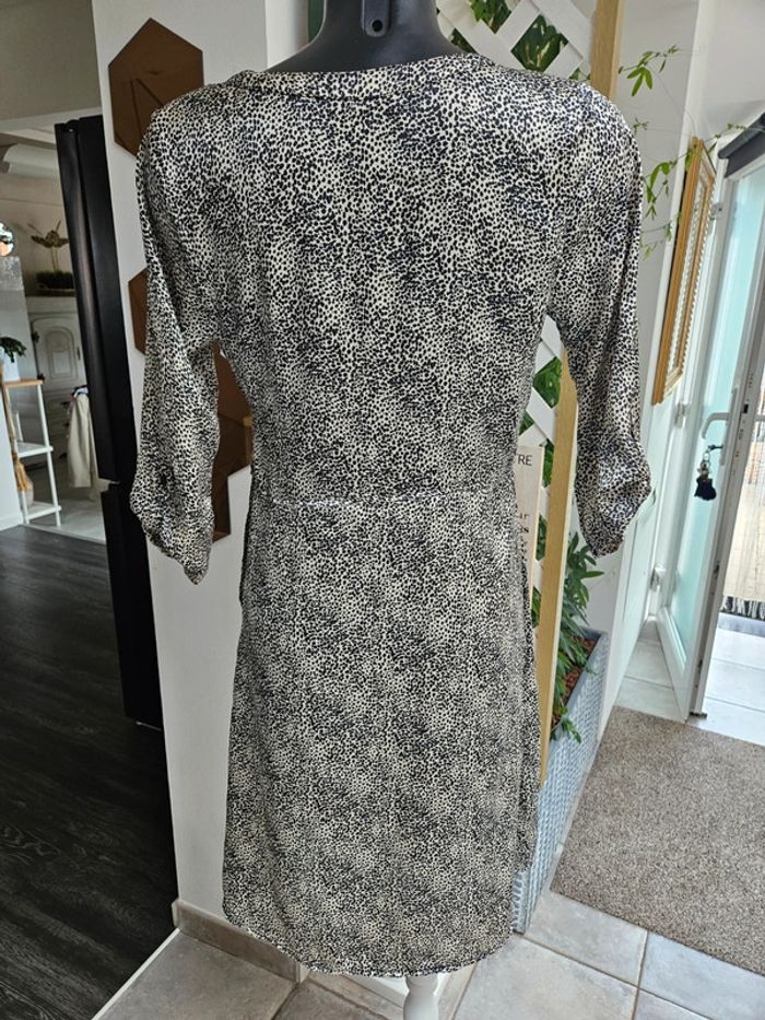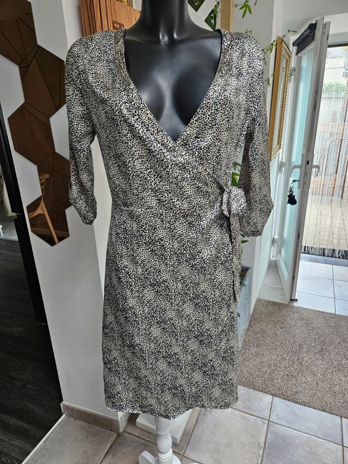 Robe qui se ferme comme un cœur croisé. Matière légère et satinée agréable à porter. Beige à points noirs en parfait état et taille parfaitement