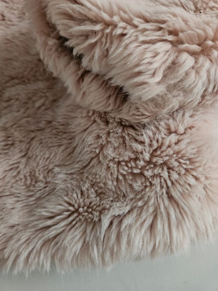 Gilet bien chaud tout doux. Il est en excellent état à l'extérieur. L'intérieur est beige pailletés avec Légères bouloches mais ne se voit pas du tout porté. De couleur rose poudré