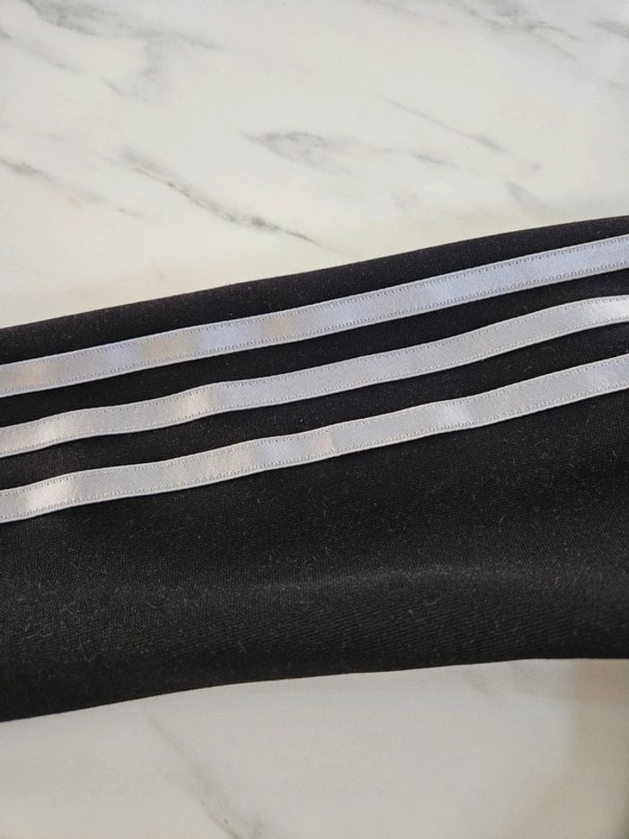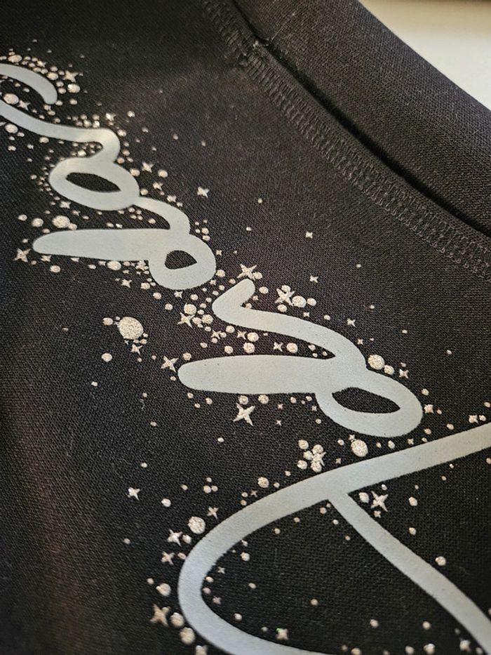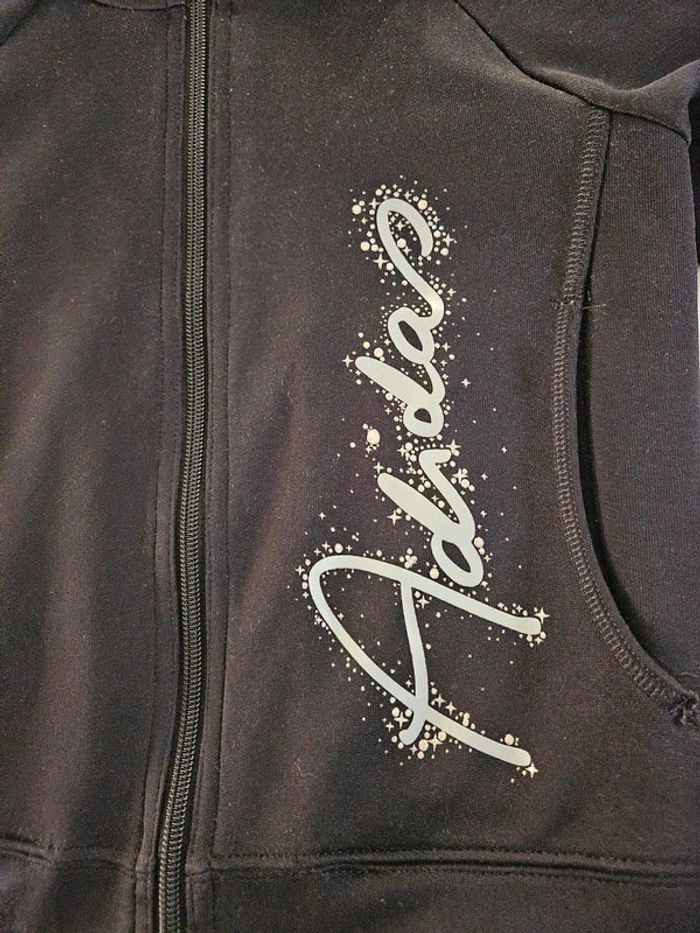 Veste noir écritures et bandes grises. Pailletées sur le devant. Portée mais elle reste en très bon état. Juste petite accroc sur le bas de la manche visible sur photo. Ce n'est pas un trou juste un accroc. Bien bien noir contrairement aux photos. Matière agréable un peu lycra