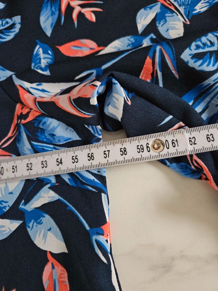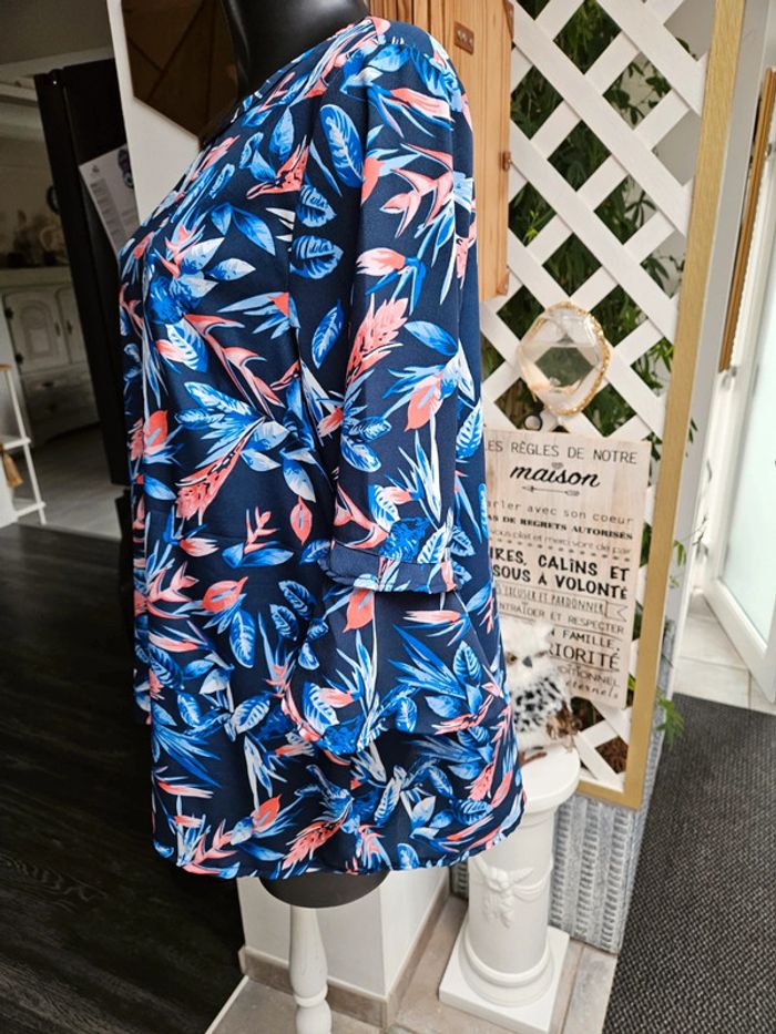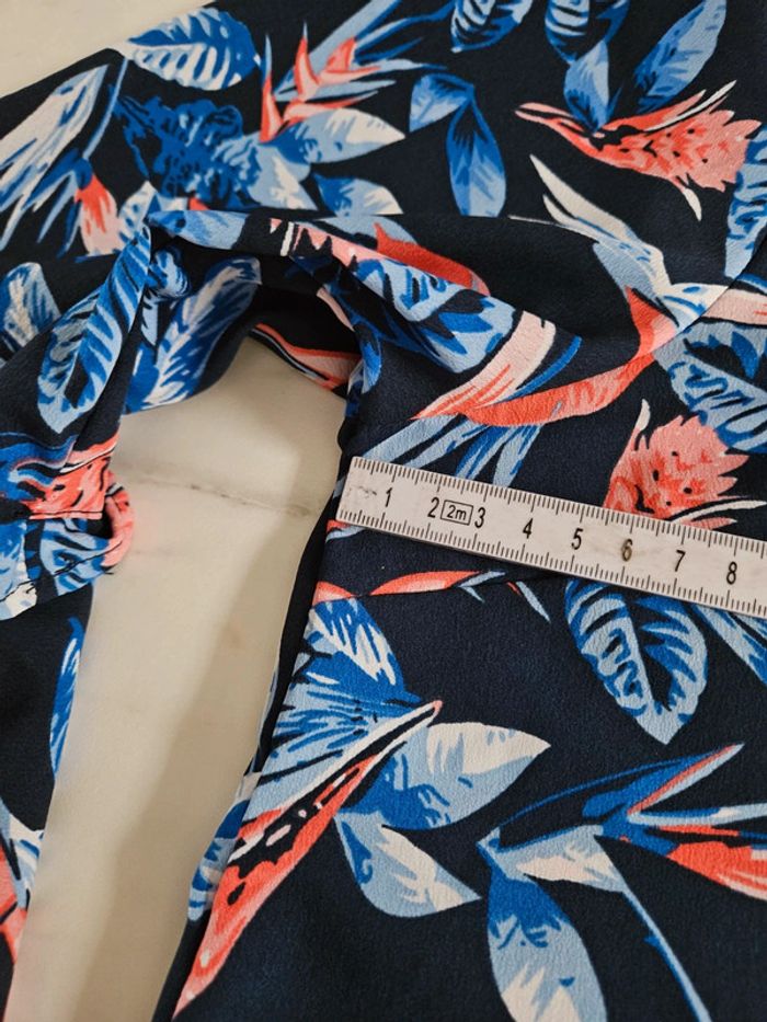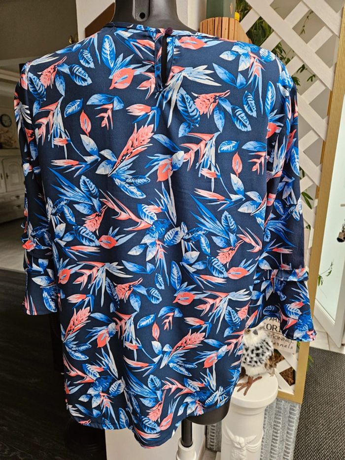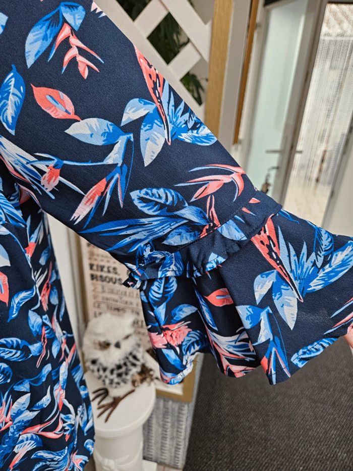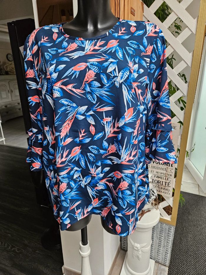 Blouse manches à volants bleu à motifs bleus blancs et rose. Matière légère et agréable excellent état