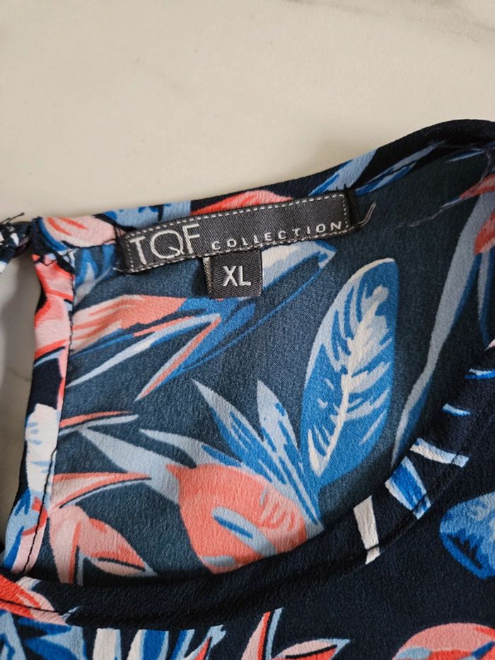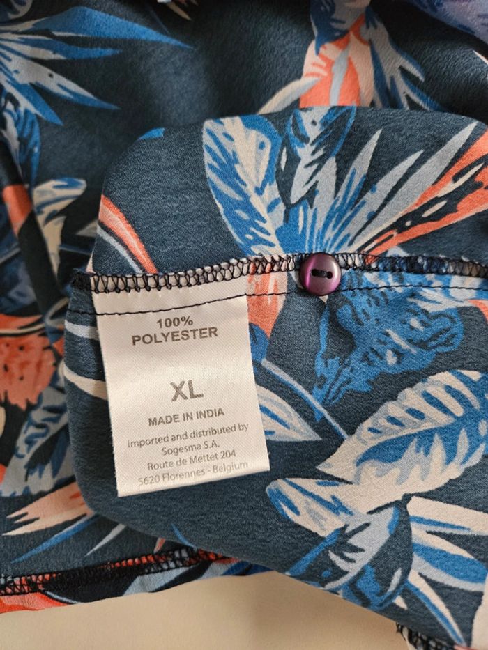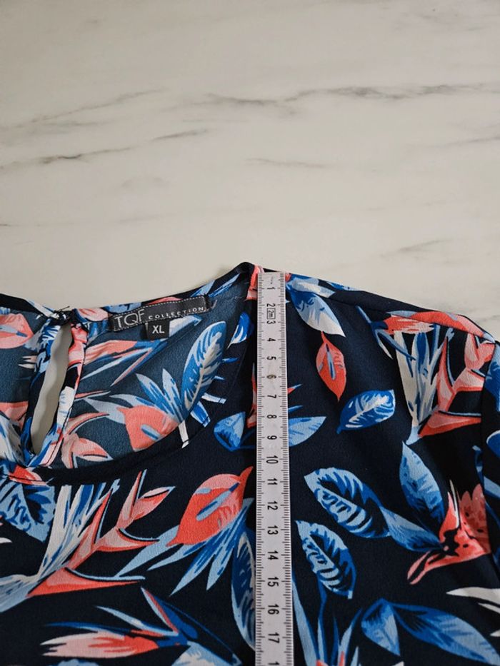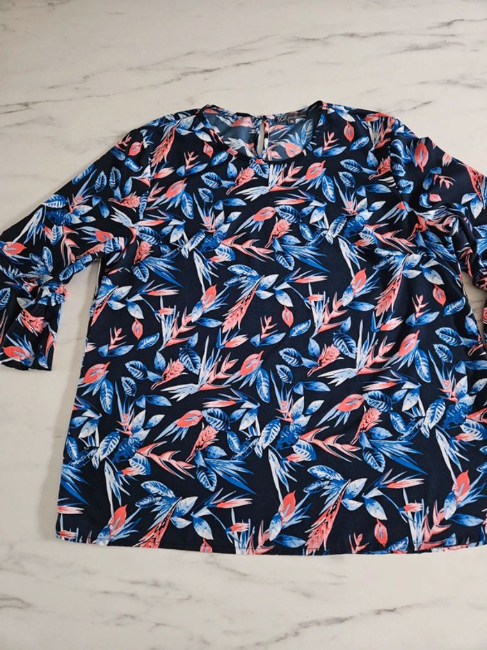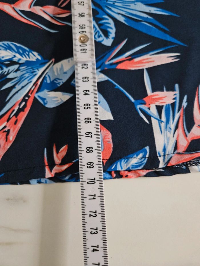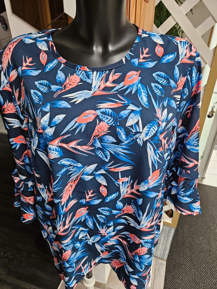 Blouse manches à volants bleu à motifs bleus blancs et rose. Matière légère et agréable excellent état