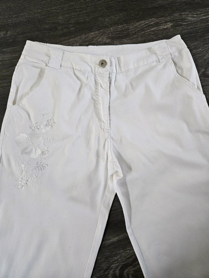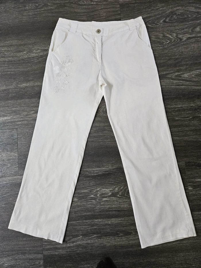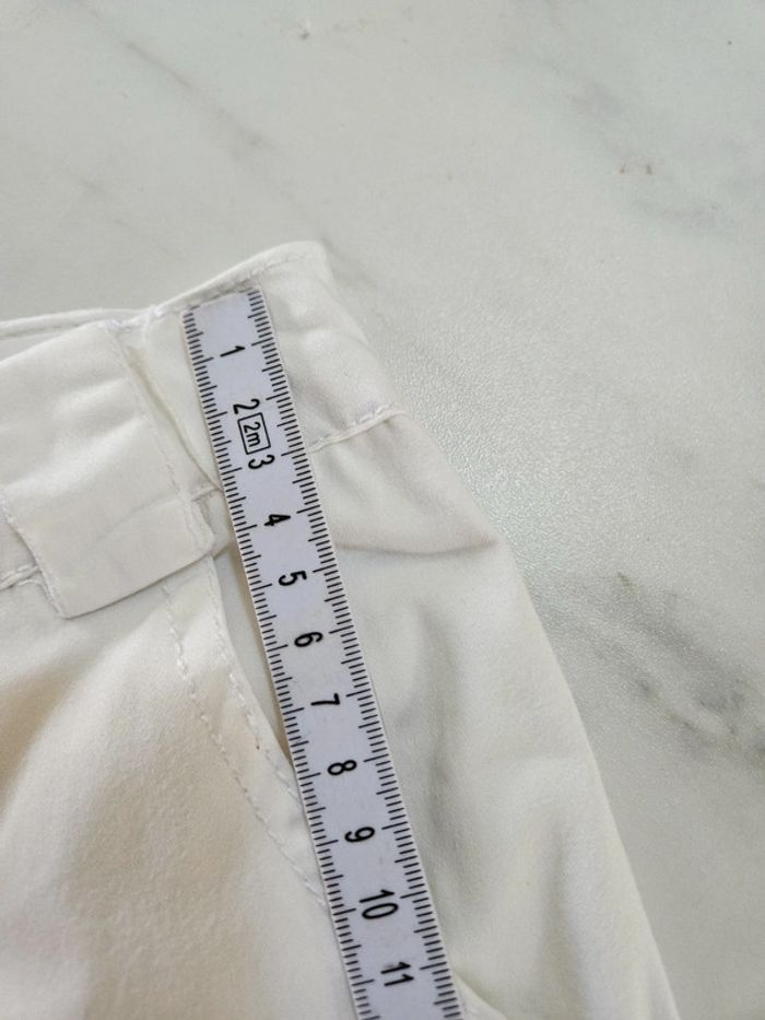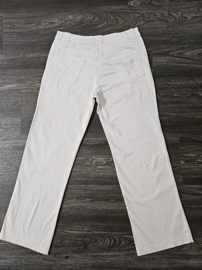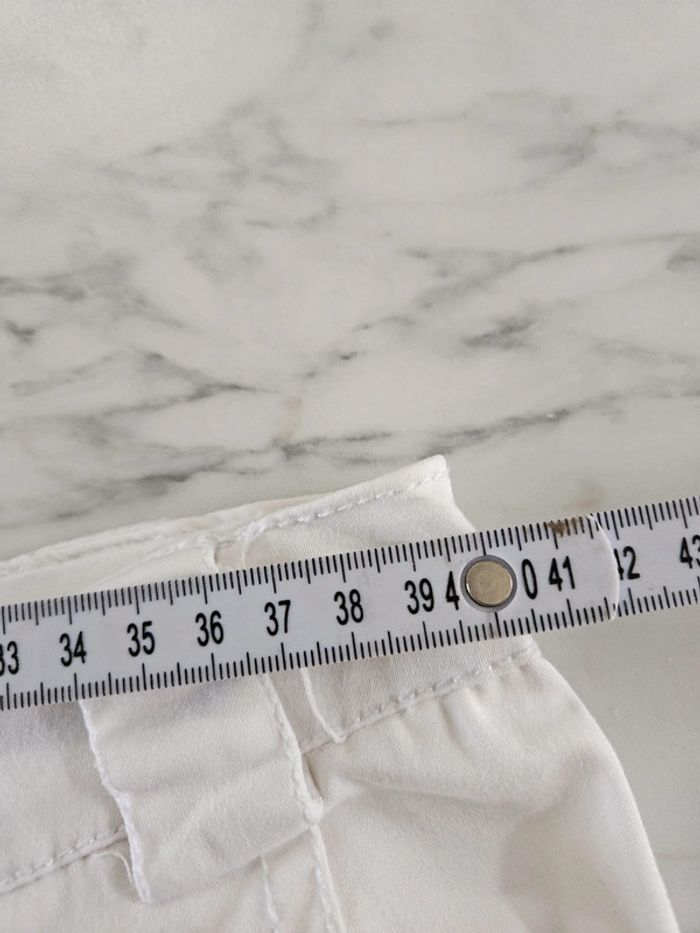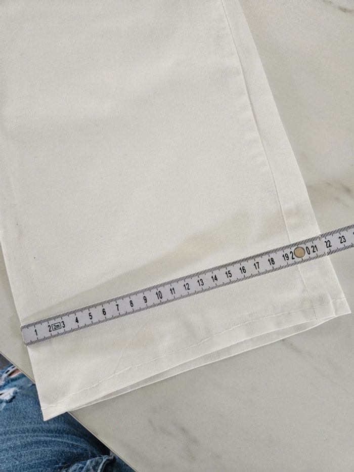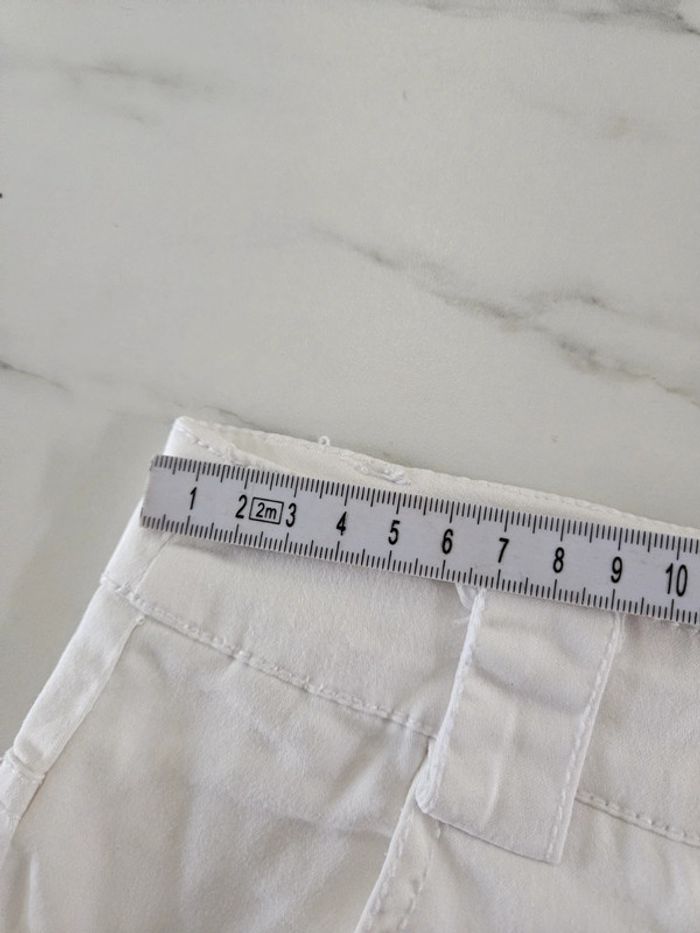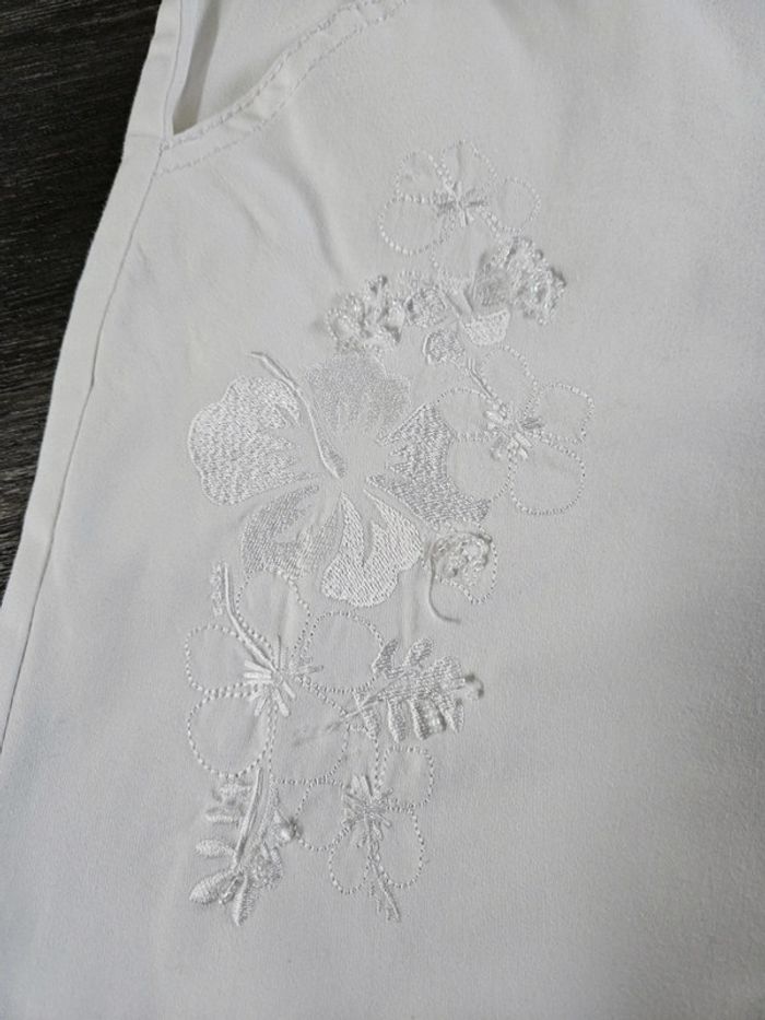 Blanc légé avec motifs devant et sur les poches arrières et perles qui se sont un peu enlevées mais ça ne se voit pas du tout. Très bon état Taille petit dimensions sur les photos