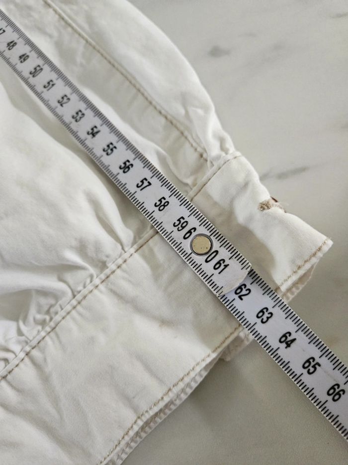 Porté quelques fois mais il reste en bon état. La taille ne correspond pas c'est un bon S petit M dimensions sur les photos par précaution Manque un bouton à la fausse poche arrière