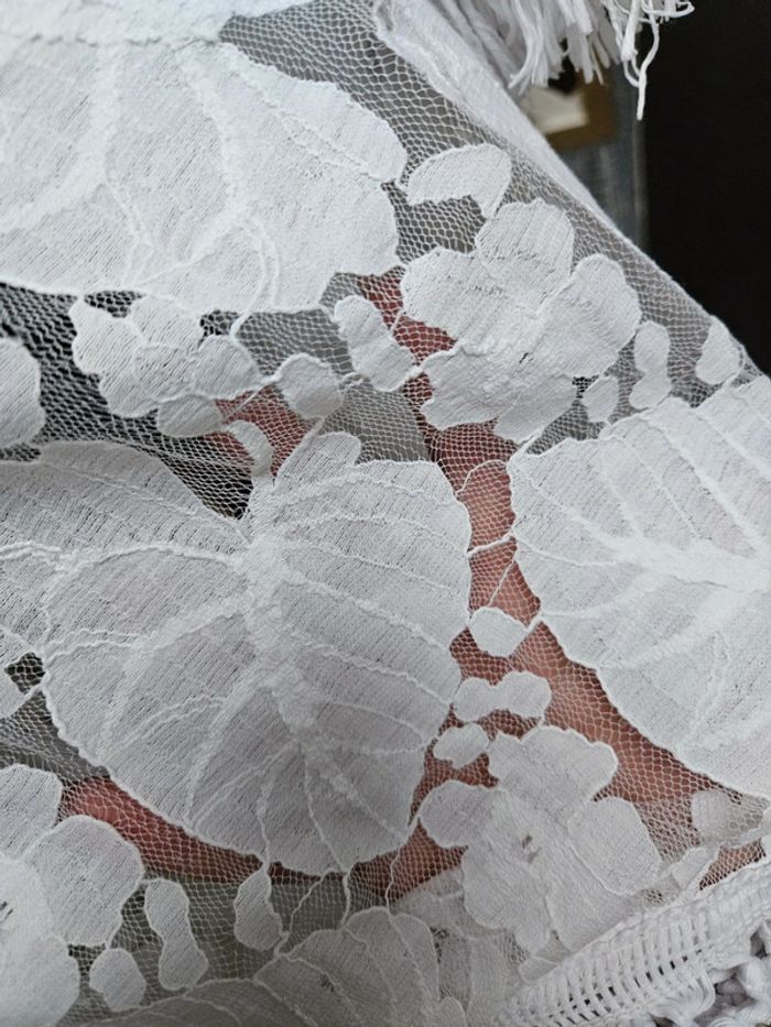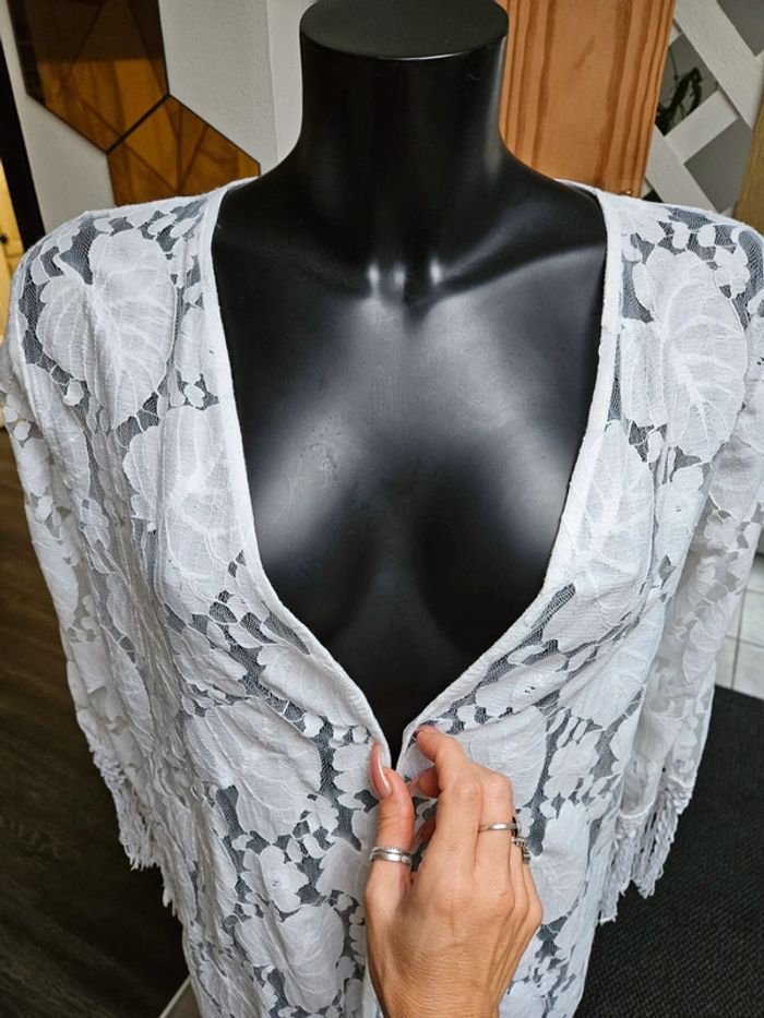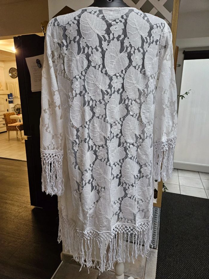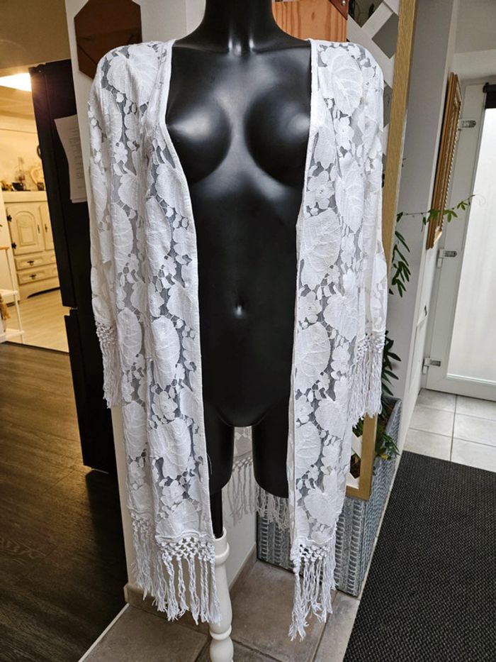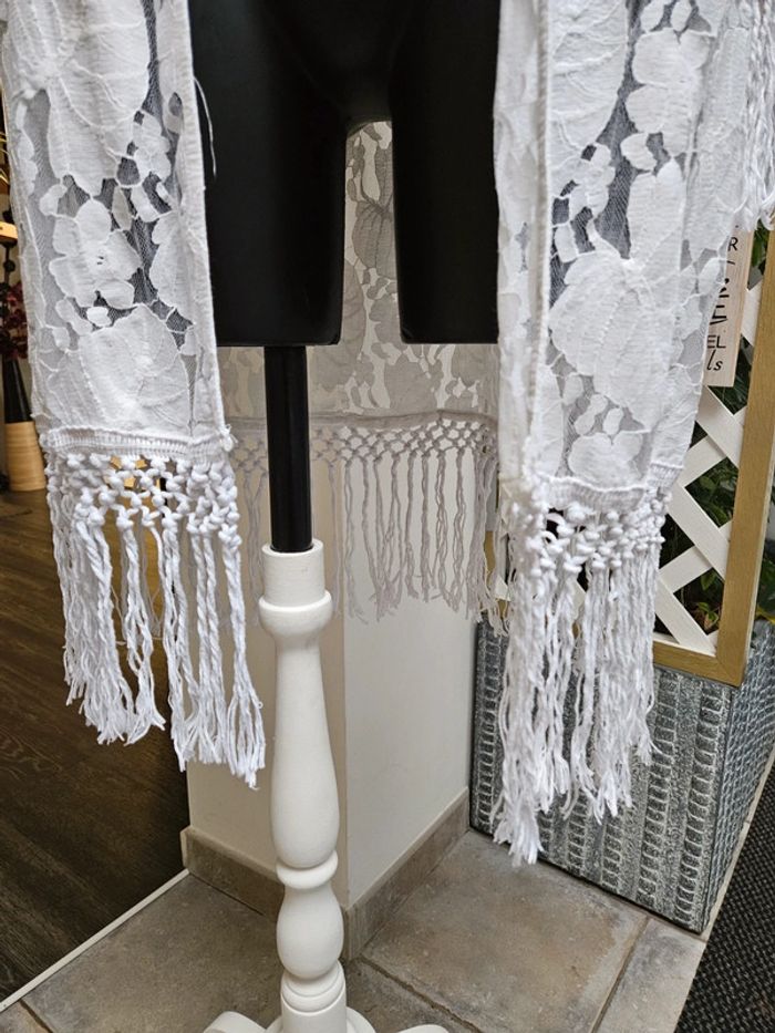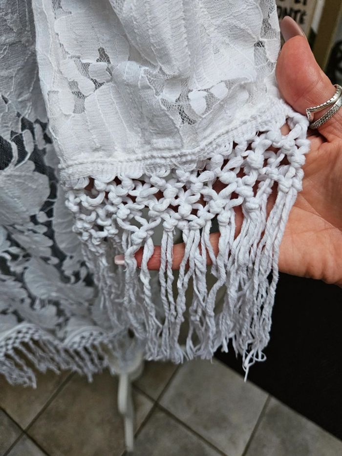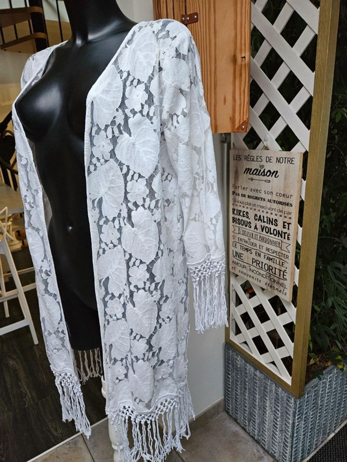 Superbe porté. franges aux manches et sur le bas, il arrive en dessous des genoux Motifs fleurs et feuilles en parfait état. Taille S Il peut convenir pour un M mais sera plus moulant. Aucune attache pour le fermer