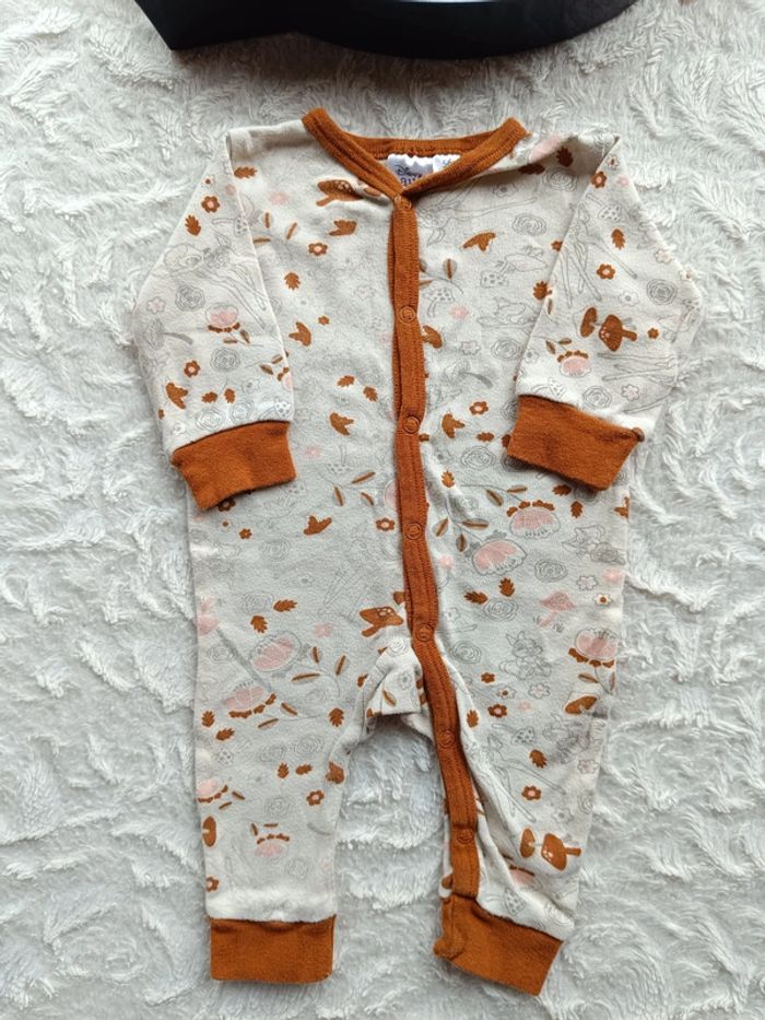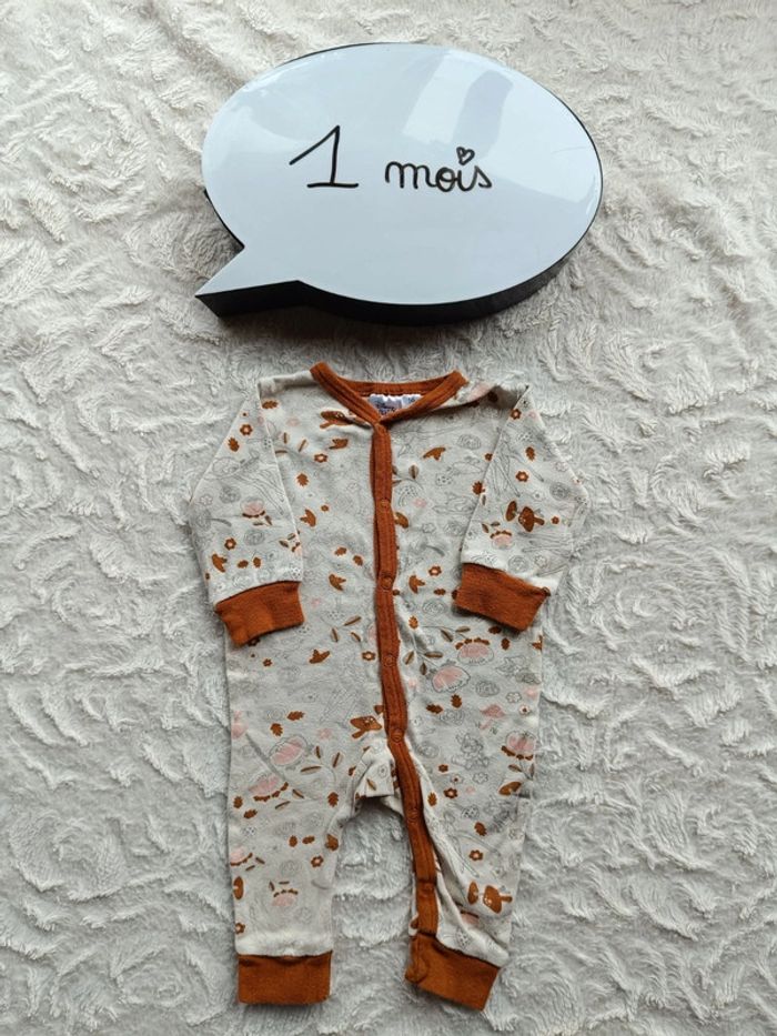 Très bon état. Taille indiquée : 56 d'où 1 mois. Ouverture par pressions sur le devant et le côté pour un habillage et un change plus facile. #nathatfcFille1mois