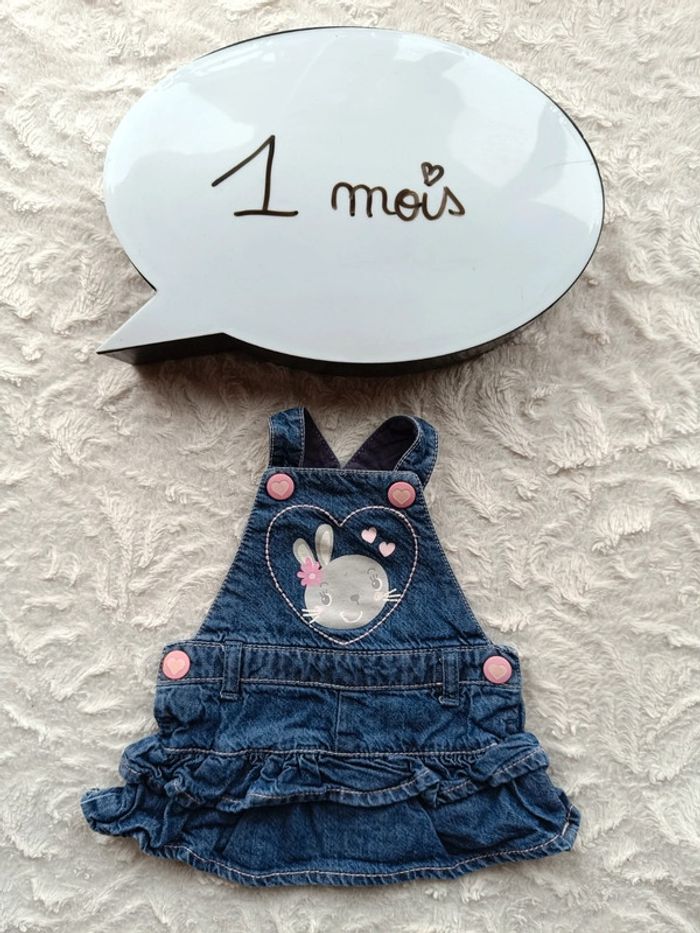 Très bon état même si porté plusieurs fois, la tête du lapin a une légère craquelure (voir la dernière photo). 2 hauteurs de bretelles possibles. Taille indiquée : 56 cm d'où 1 mois. #nathatfcFille1mois