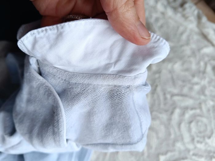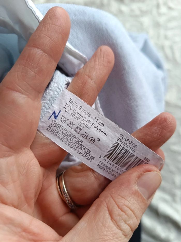 Bon état car petite décoloration au niveau du col et ses alentours, en effet il y avait une petite tâche sur le col que j'ai réussi à faire partir avec du détachant mais j'en ai mis un peu trop et ça a débordé sur la partie bleue du pyjama sous le col, après ça reste discret. Ouverture par pressions sur le devant pour un habillage et un change plus facile. Doux au toucher. #nathatfcGarçon9mois