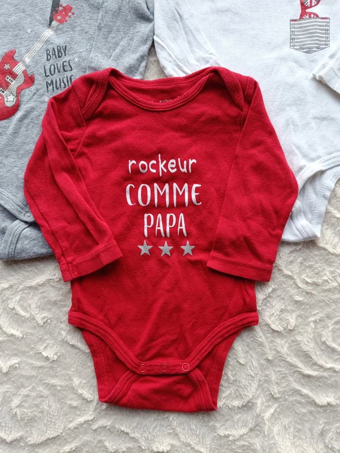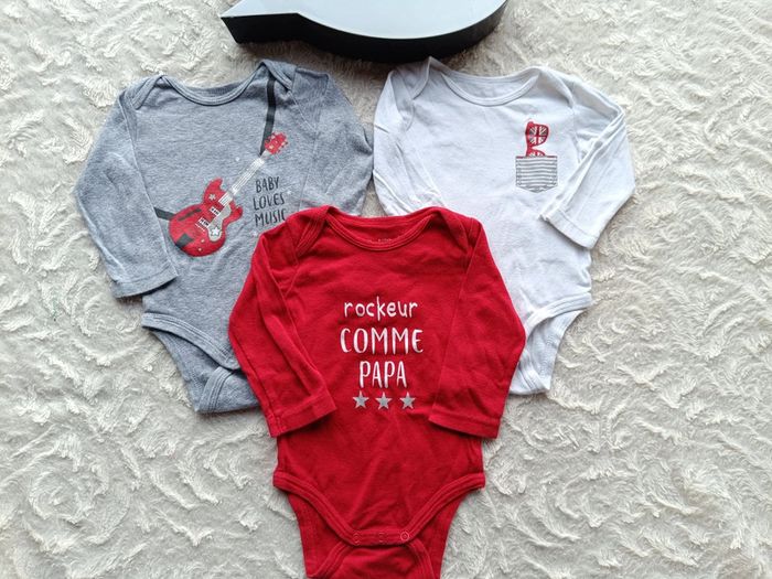Lot de 3 bodies manches longues Garçon 9 mois Rockeur comme Papa guitare Baby loves music 100% coton - photo numéro 1