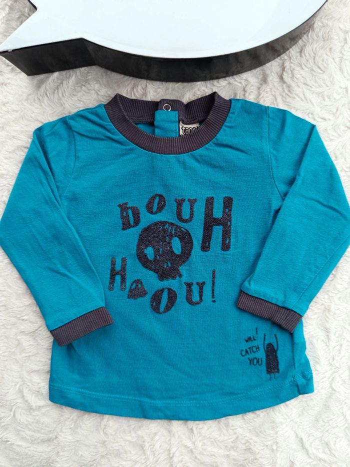 Tee shirt chemise manches longues Garçon 6 mois bouh tête de mort halloween Tao 100% coton - photo numéro 1