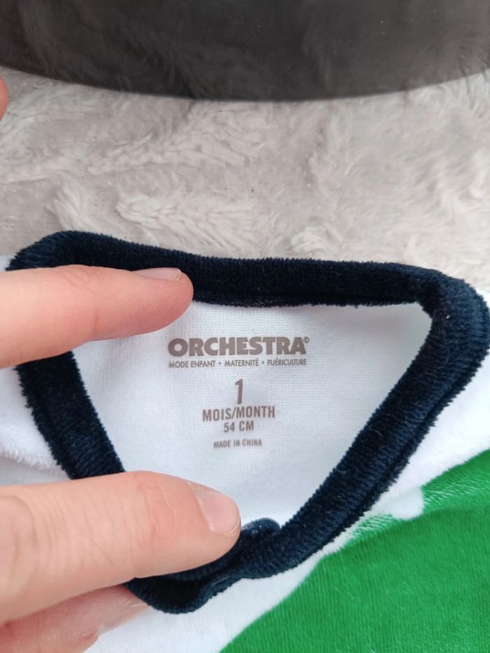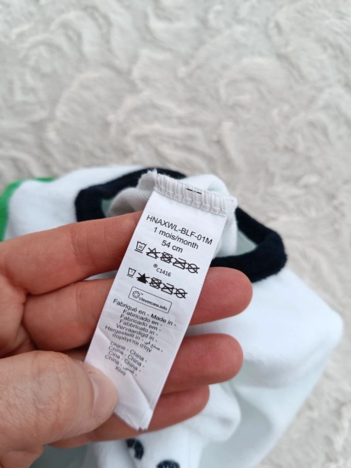 Excellent état, très peu porté, comme neuf, tout doux. Resserré au niveau des chevilles. Ouverture par pressions sur le côté et au niveau de l'entrejambe pour un habillage et un change plus facile. #nathatfcGarçon1mois